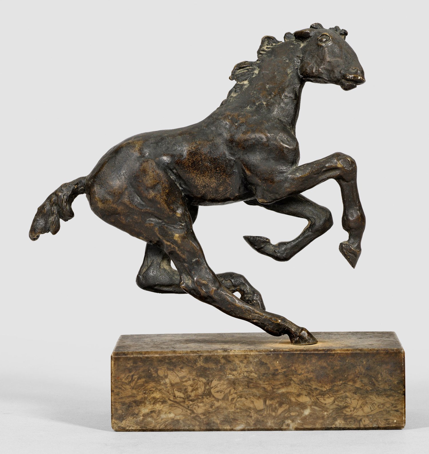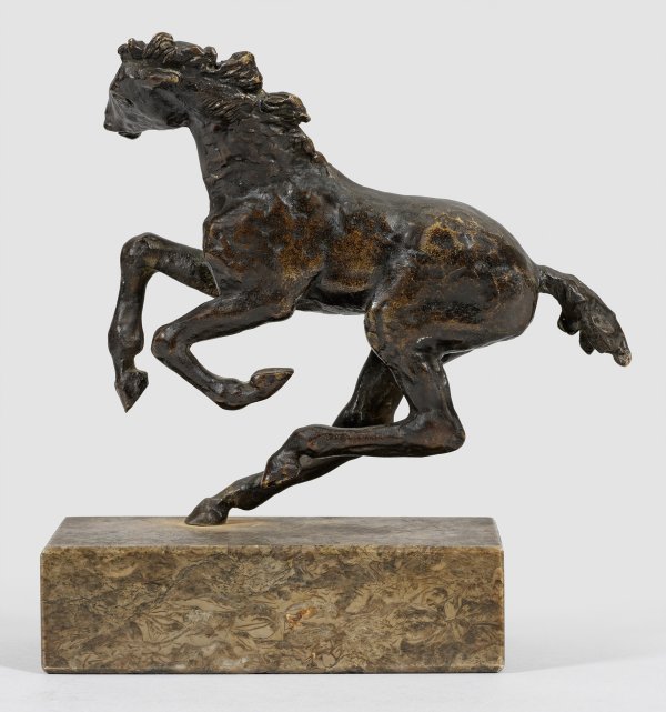 Bronze, in nuancierten gold- bis dunkelbraunen Tönen patiniert, 1928. Unter einem Huf monogr. „R S“. Heller Steinsockel. Wvz. Berger/Ladwig Nr. 103, Buhlmann Nr. 138. Dynamische Darstellung im Bewegungsmoment mit der in großen Wellen geschilderten Mähne und der lebendigen Modellierung. Aufmerksam beobachtete Tierdarstellung der Künstlerin, die als passionierte Reiterin eine besondere Vorliebe für Pferde besaß. Im Oeuvre der vor allem durch ihre Tierplastiken bekannten, modernen Bildhauerin nehmen Pferde, Fohlen und Ponys als Motiv eine bedeutende Stellung ein. Schon mit ihren ersten plastischen Arbeiten hatte Sintenis ab 1913 große Erfolge, sie beteiligte sich an Ausstellungen der Berliner Secession und Freien Secession; ihr wichtigster Galerist war 1920 - 1933 Alfred Flechtheim. 1931 wurde sie als erste Bildhauerin Mitglied der Berliner Akademie der Künste. In der Zeit des Nationalsozialismus musste die Bildhauerin als verfemte Künstlerin nicht nur finanzielle Einschränkungen erleben, Werke wurden aus öffentlichen Sammlungen entfernt und sie selbst 1934 wegen ihrer jüdischen Herkunft aus der Akademie ausgeschlossen. H. 12,2 cm. Ges.-H. 15,3 cm.