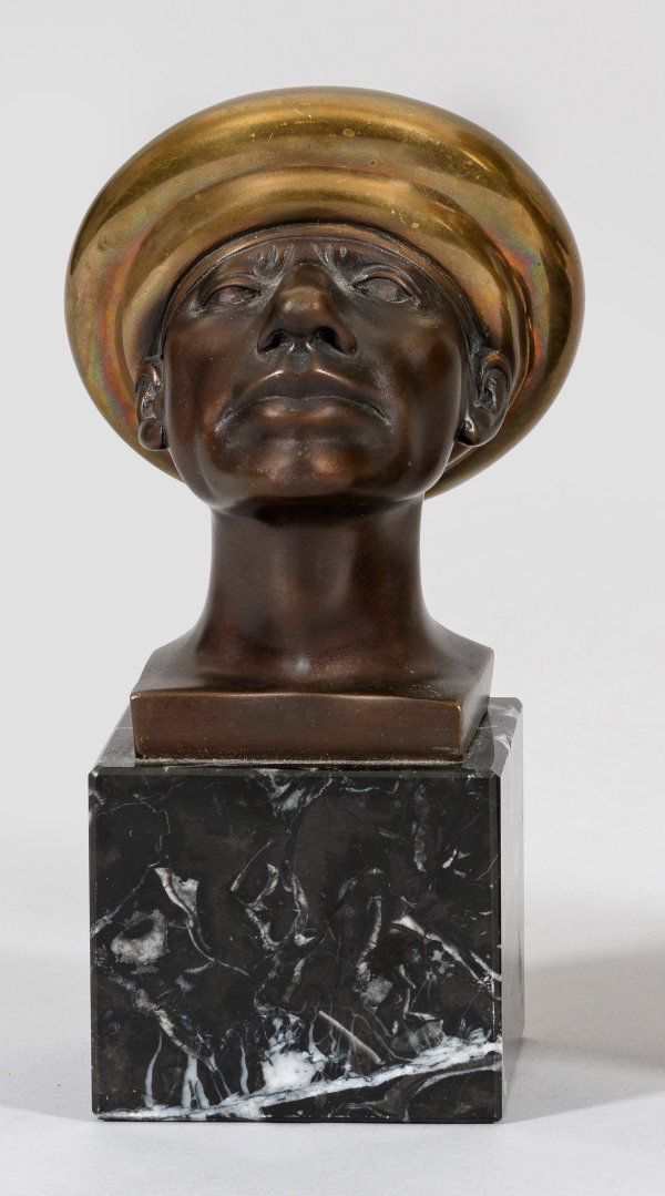 Bronze dunkelbraun patiniert und teilvergoldet. Sockel aus schwarzem, weiß geädertem Marmor. Stempelsign. und nummeriert 466/1250, Gießerstempel. Wie in vielen seiner Bilder und Bronzen trägt auch dieser Kopf die markanten Gesichtszüge des Künstlers. Hausner gilt als einer der bedeutendsten Vertreter der Wiener Schule des Phantastischen Realismus. H. 19 cm.