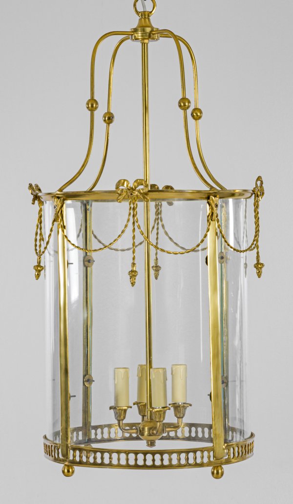 4-flg.; Messing. Zylinderförmiger Korpus aus flachen Streben, umgeben von schmalen Kordelfestons mit Schleifenbekrönungen. Hochgewölbter oberer Abschluss aus geschwungenen Streben sowie in der Mitte schlanker Schaft als Träger für Leuchtmittel. Bombierte Glaseinsätze. Elektrifiziert. H. 81 cm. D. 41 cm.