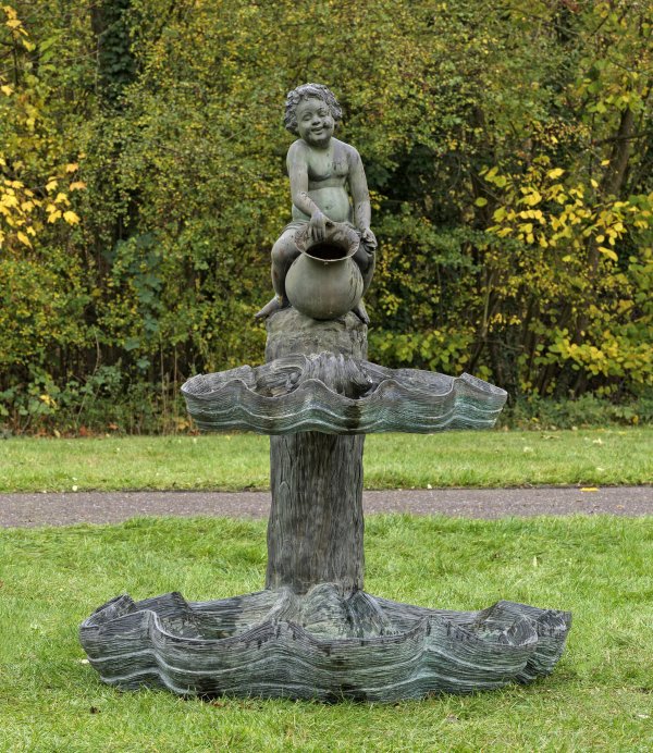 Bronze, braun-grün patiniert. Über naturalistisch gestalteter Stele vollplastische darstellung eines lachenden Puttenknaben als Brunnenfigur. Unterhalb gestuft angeordnete Brunnenschalen aus passig geschweiften Jakobsmuscheln unterschiedlicher Größe. H. 165 cm.
