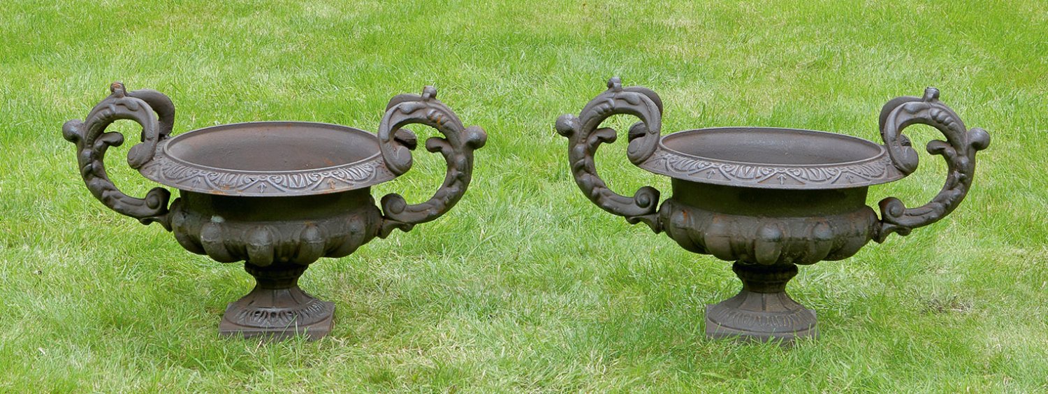 Gusseisen mit Rostpatina. Über quadratischer Plinthe gedrückter, umlaufend godronierter Korpus mit breitem, weit vorkragendem, reliefiertem Lippenrand. Stark geschwungene Henkel aus üppigen Blattvoluten. H. 48 cm.