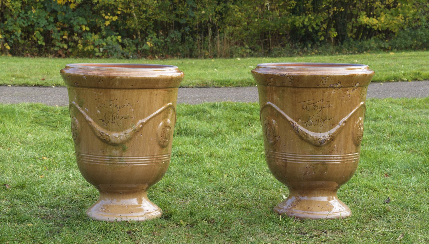 Terrakotta, braun und partiell grün glasiert. Über profilierter Basis sich weitender, kelchförmiger Korpus mit breitem, leicht vorkragendem Lippenrand. Umlaufend der Wandung erhaben reliefierte, stilisierte Festons. Unten geöffnet. H. 80 cm.
