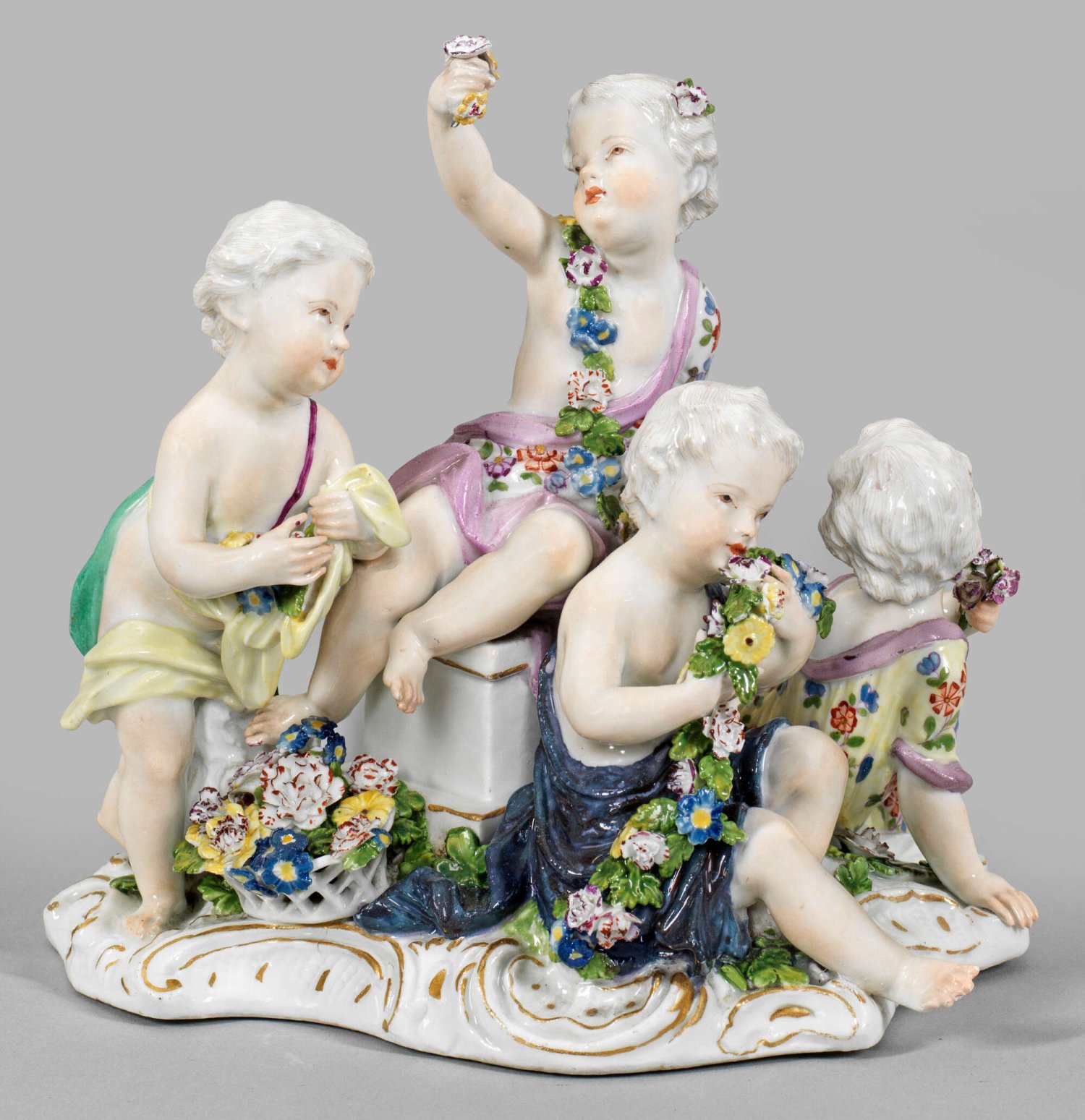 Allegorische Figurengruppe "Der Frühling" aus der Serie "Vier Jahreszeiten". Auf rocaillegerahmtem, mit plastischen Blüten und Blättern belegtem Sockel vier dargestellte Amoretten mit verschiedenen Blumen, einer Blumengirlande und einem, mit Blüten gefüllten Korb als Personifikation des Frühlings. Polychrome Malerei mit Goldstaffage. Entw. Carl Christoph Punct. Unw. best./rest.; Schwertermarke. H. 17,5 cm.
