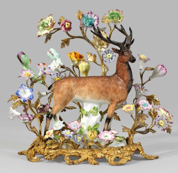 Jagdliche Tafeldekoration mit Figur eines Rothirsches Von stark reliefplastisch gearbeiteten Blattvoluten getragene, vergoldete Bronzemontierung mit stehendem, vollplastisch gearbeitetem Zehnender in naturalistischer Ausführung über reliefiertem, von plastischen Blüten und Blättern belegtem Terrainsockel. Rückseitig aufsteigende Äste mit filigran geformten, farblich staffierten sog. Vincennes-Blüten aus Porzellan. Polychrome Malerei. Entw. Johann Joachim Kaendler. Minim. rest.; Schwertermarke. Ges.-H. 21 cm. 25 cm x 13 cm.