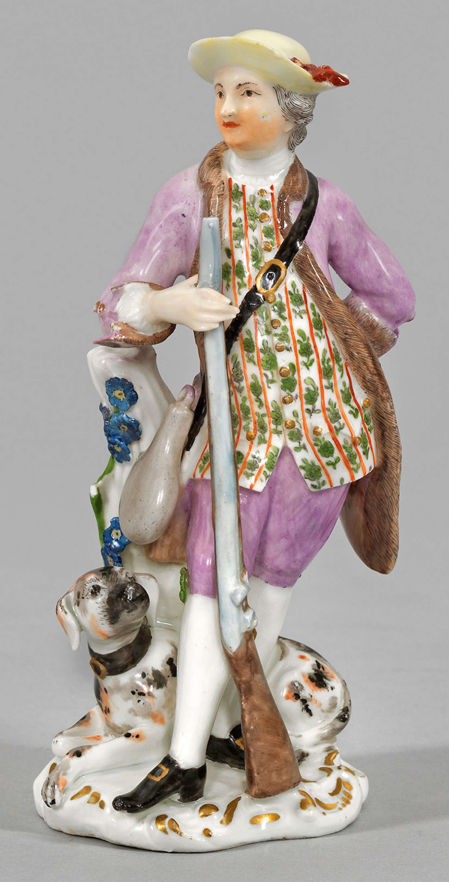 Jäger mit Hund Stehender Jäger im pelzgefütterten, purpurfarbenen Gehrock, mit umgehängter Pulverflasche und einem Jagdgewehr in der rechten Hand. Daneben sitzender Jagdhund. Polychrome Malerei. Goldstaffage. Minim. best./rest.; H. 15 cm.