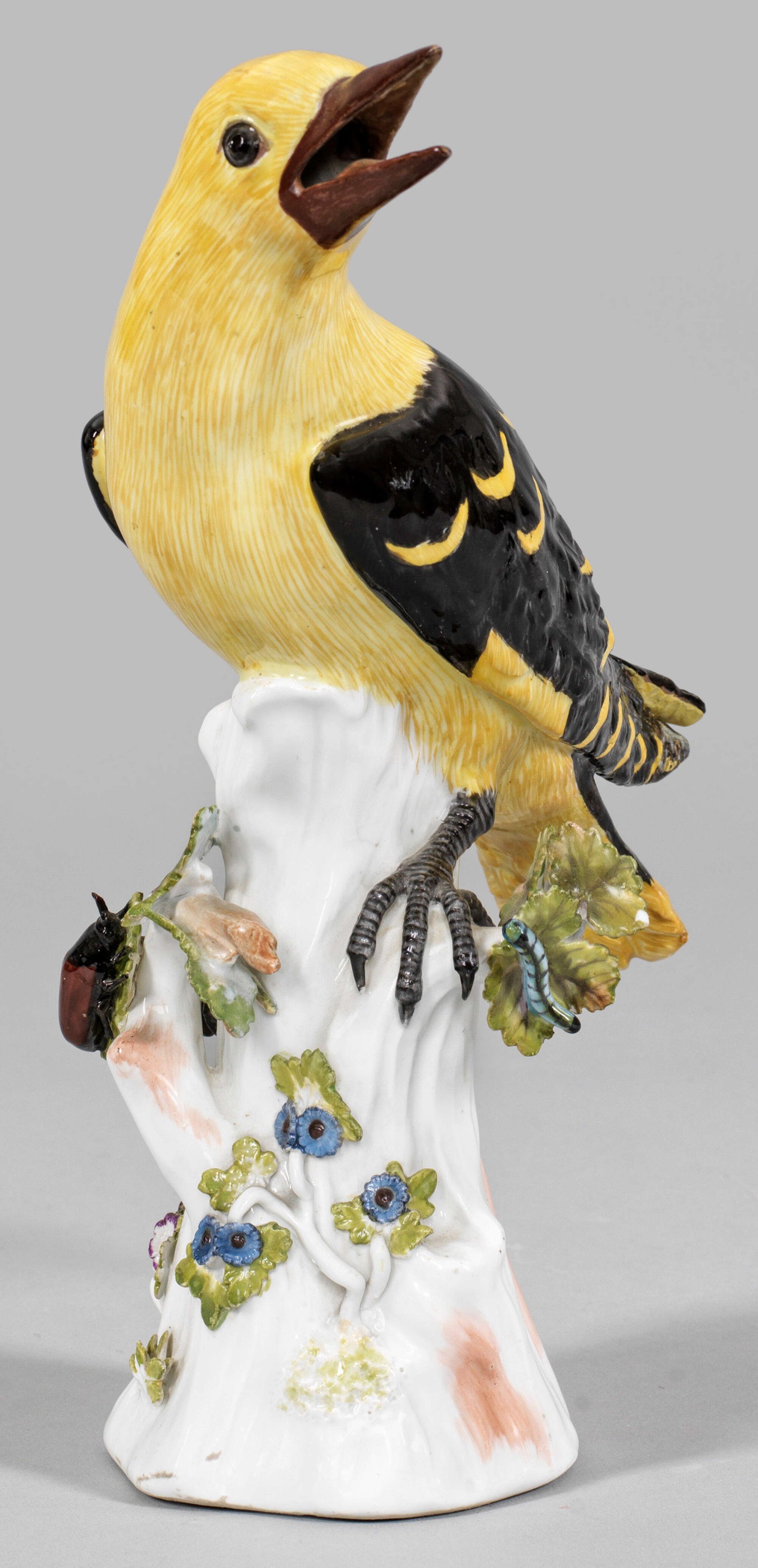 Pirol Auf hohem, mit plastischen Blüten und Blättern sowie Insekten belegten Baumstumpfsockel sitzender Pirol. Naturalistisch reliefiertes, leuchtend gelbes Gefieder mit schwarzen, angelegten Flügeln. Polychrome Malerei. Entw. Johann Joachim Kaendler und Johann Gottlieb Ehder. Rest.; H. 26,5 cm.