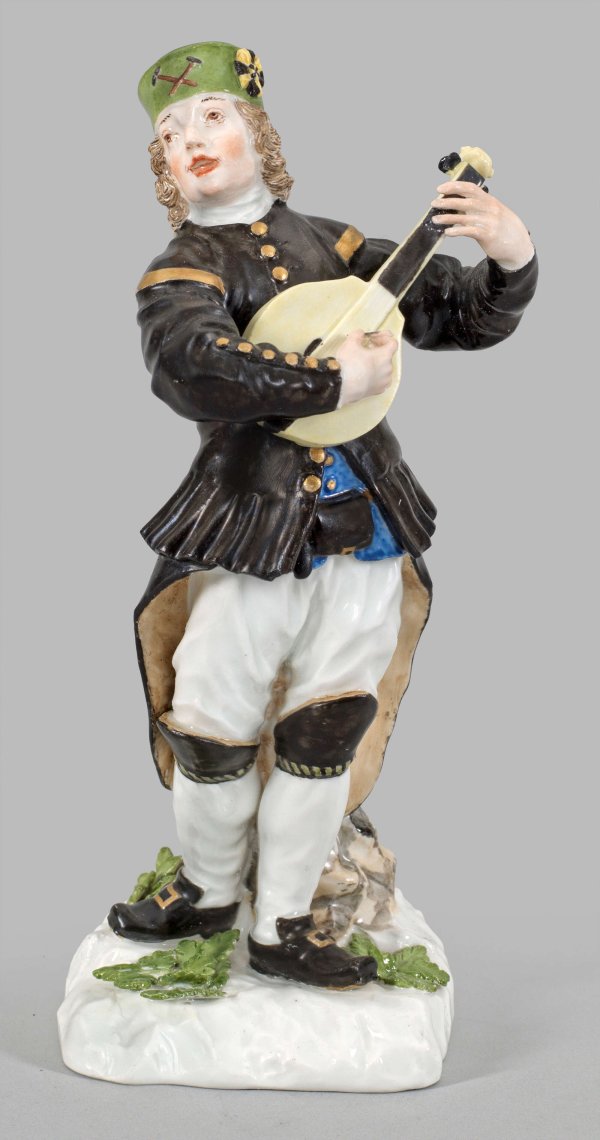 Bergsänger mit Laute aus der Serie der "Bergmannsfiguren". Auf stilisiertem, mit plastischen Blättern belegtem Sockel stehender sächsischer Bergsänger in weißer Hose, schwarzer Jacke mit goldenen Knöpfen über blauem Wams mit schwarzer Tscherpertasche sowie hellgrünem Schachthut. Polychrome Malerei mit Goldkonturierung. Entw. Johann Joachim Kaendler und Peter Reinicke. Schwertermarke. H. 20,5 cm.