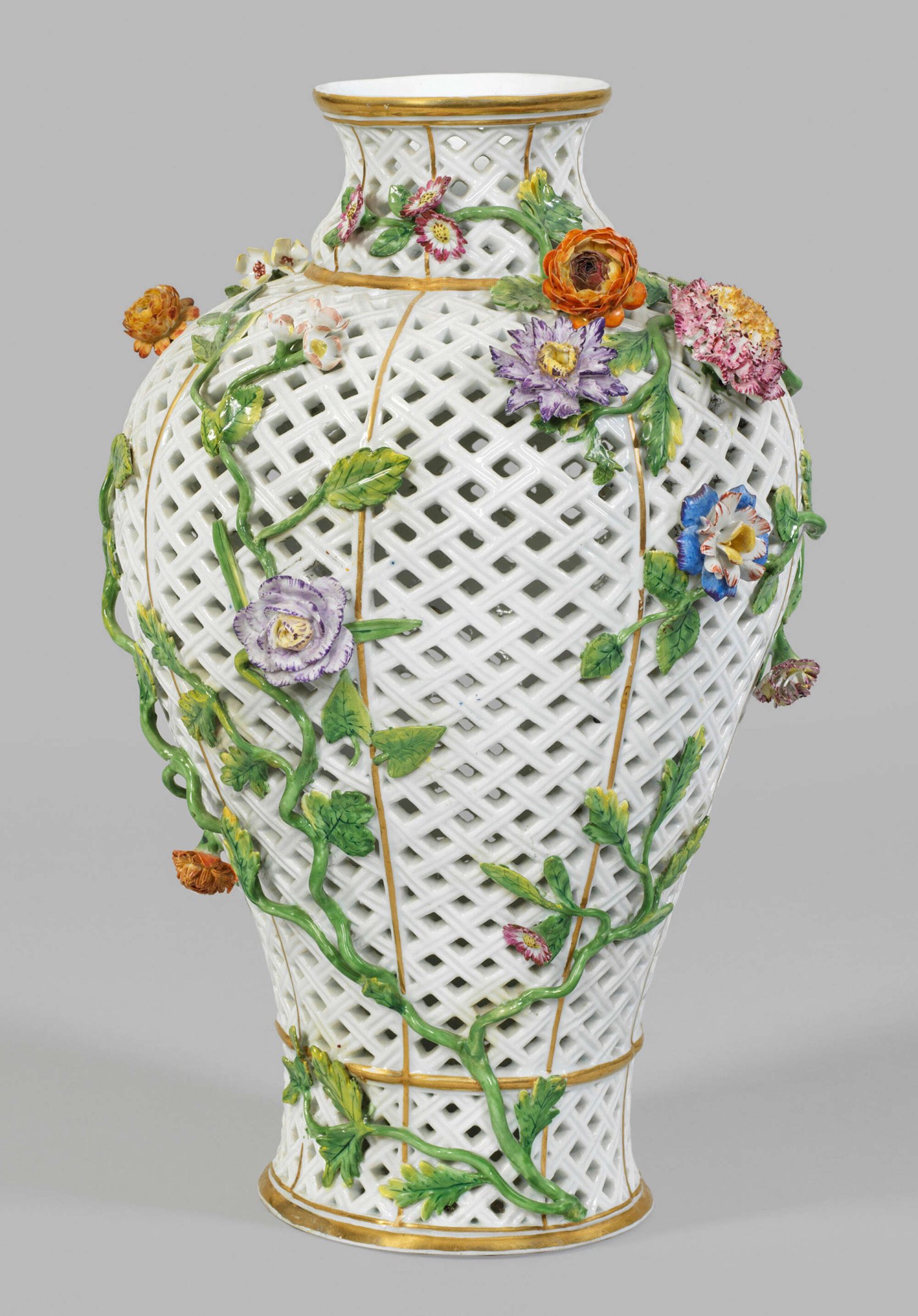 Große Ziervase mit Flechtwerk und Blumendekor Balusterförmiger Korpus mit abgerundeter Schulter, kurzem, geschwungenem Hals und profiliertem Lippenrand. Korbartig durchbrochen gearbeitete und reliefierte Wandung aus stilisiertem Weidengeflecht mit Goldkonturierung, allseitig umzogen von plastisch aufgelegten, sich verzweigenden Blattranken mit unterschiedlichen, großen, farbig staffierten Blüten. Unw. rest.; Schwertermarke. H. 41 cm.