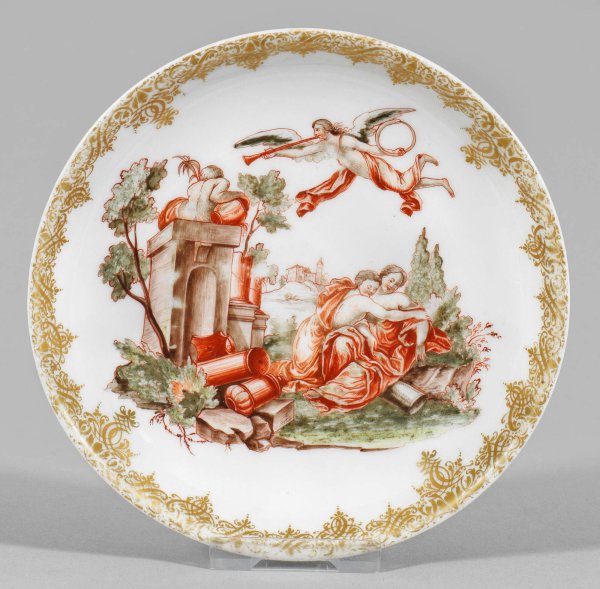 Runde, gemuldete Form. Auf der Außenwandung reliefierte Prunuszweige, sog."Irmingersche Belege" aus der Frühzeit der Manufaktur. Im Spiegel eine bildmäßige Ruinenlandschaft mit antikisierendem Liebespaar, darüber schwebend Nike mit Flöte und Reif in Hausmalerei, wohl aus der Werkstatt von Franz Ferdinand Mayer-Preßnitz, um 1750. Gold minim. ber.; D. 13 cm.