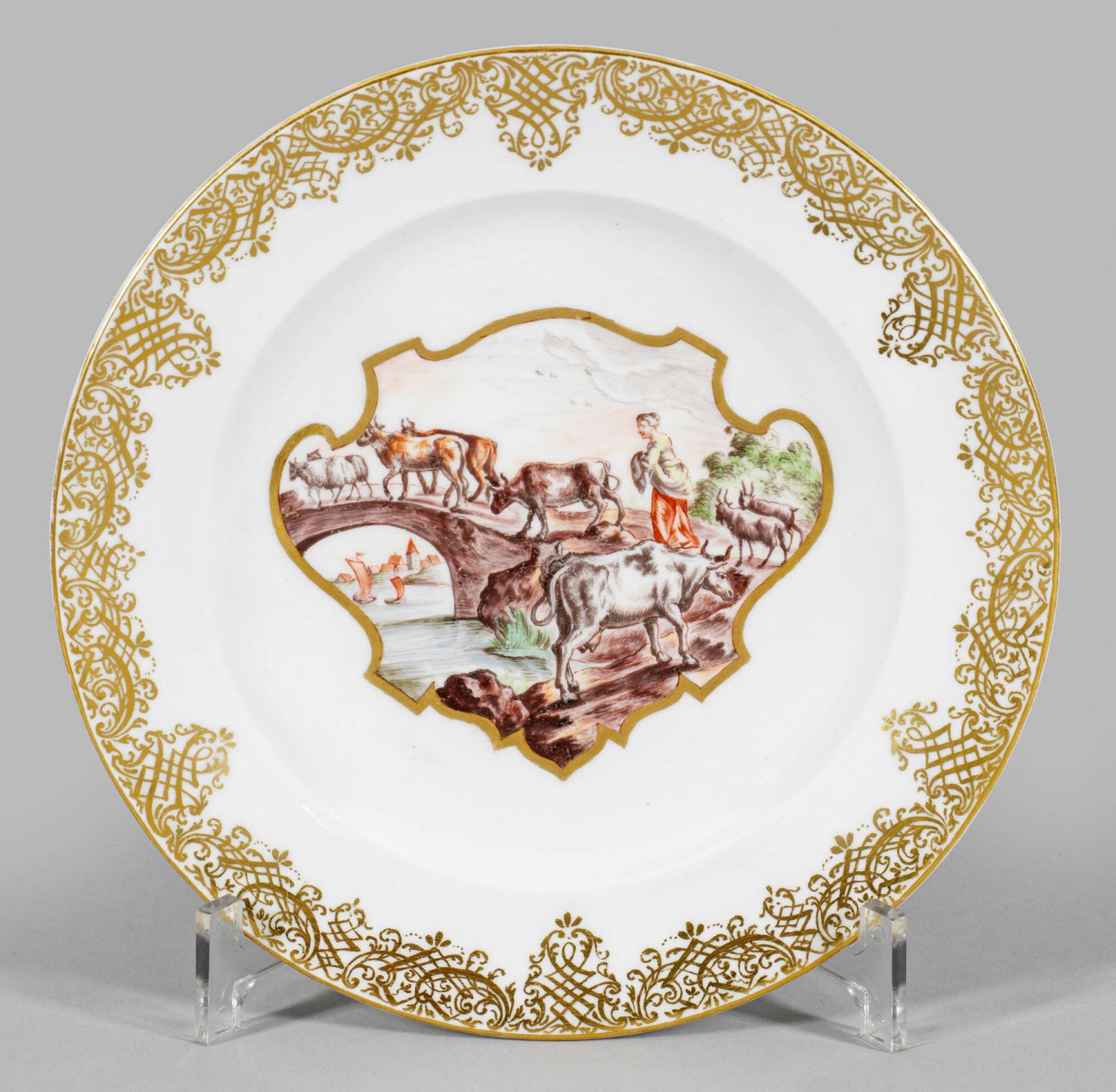 Runde Form. Im leicht vertieften Spiegel eine goldkonturierte, schildförmige Reserve, darin Flusslandschaft mit Hirtin, Vieh über eine Brücke führend. Fahne mit breiter Goldspitzenbordüre. Polychrome Hausmalerei von Franz Ferdinand Mayer in Preßnitz. Minim. ber.; Schwertermarke. D. 21 cm.