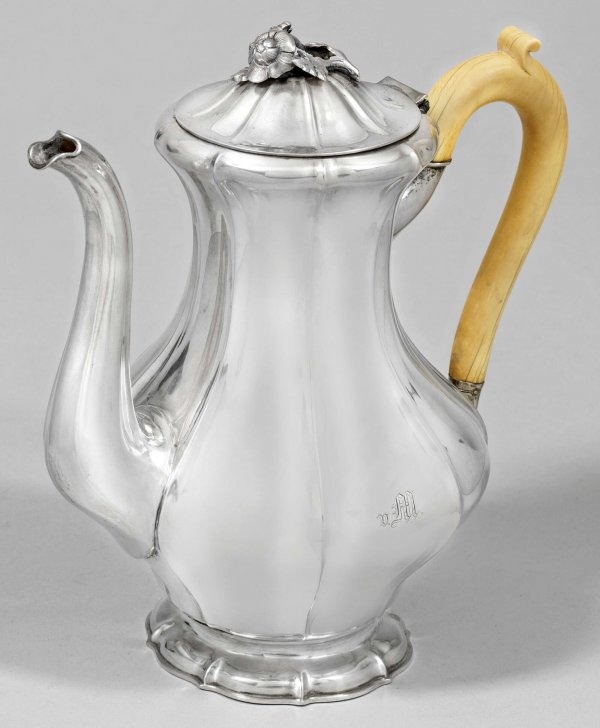 Neo-Rokoko-Teekanne Silber. Über geschweiftem Stand stark gedrückt bauchiger Korpus, gegliedert durch schmale Grate. Schauseitig graviertes Monogramm "v. M.". Tief angesetzte Tülle, Ohrenhenkel aus Elfenbein. Gewölbter Deckel bekrönt von Blütenknauf. Gest., Tremolierstrich, Stadtmarke, Jahresbuchstabe C, Meistermarke AS, Herstellerzeichen. Gew. ca. 720 g. H. 24 cm.