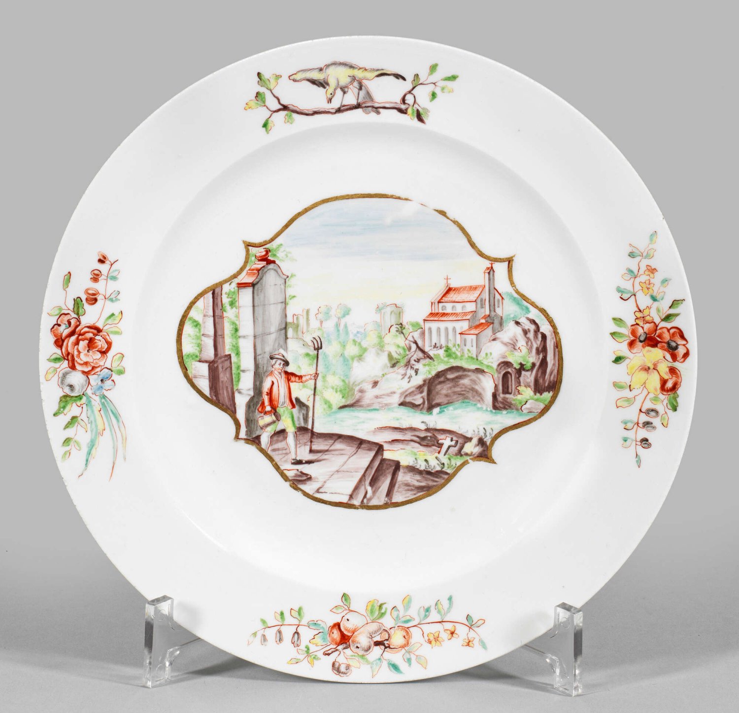 Runde Form. Im leicht vertieften Spiegel eine goldkonturierte, schildförmige Reserve, darin Landschaft mit Kirche an einem Fluss, im Vordergrund ein Friedhofsgärtner mit Forke und Gießkanne neben Grabdenkmälern. Auf der Fahne langgezogene Obst- und Blütenzweige sowie ein Kranich. Polychrome Hausmalerei von Franz Ferdinand Mayer in Preßnitz. Minim. ber.; Schwertermarke. D. 22,5 cm.