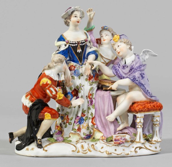 Rocaillereliefierter Sockel mit Liebesgruppe. Auf einem Polsterstuhl sitzender geflügelter Amor verkleidet als Abt, den Puls einer jungen Dame fühlend. Seitlich kniender Kavalier, ihre Hand küssend. Rückseitig stehendes Mädchen, das Geschehen beobachtend. Polychrome Malerei mit Goldstaffage. Entw. Johann Joachim Kaendler. Unw. rest.; Schwertermarke. H. 18,5 cm.