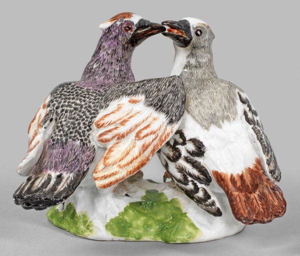 Seltenes Turteltaubenpaar Auf reliefiertem Natursockel stehendes, schnäbelndes Taubenpaar. Naturalistisch reliefiertes, in Violett-, Grauschwarz- und Brauntönen fein gezeichnetes Federkleid. Polychrome Malerei. Entw. Johann Joachim Kaendler. Rest.; Schwertermarke. H. 10,5 cm.
