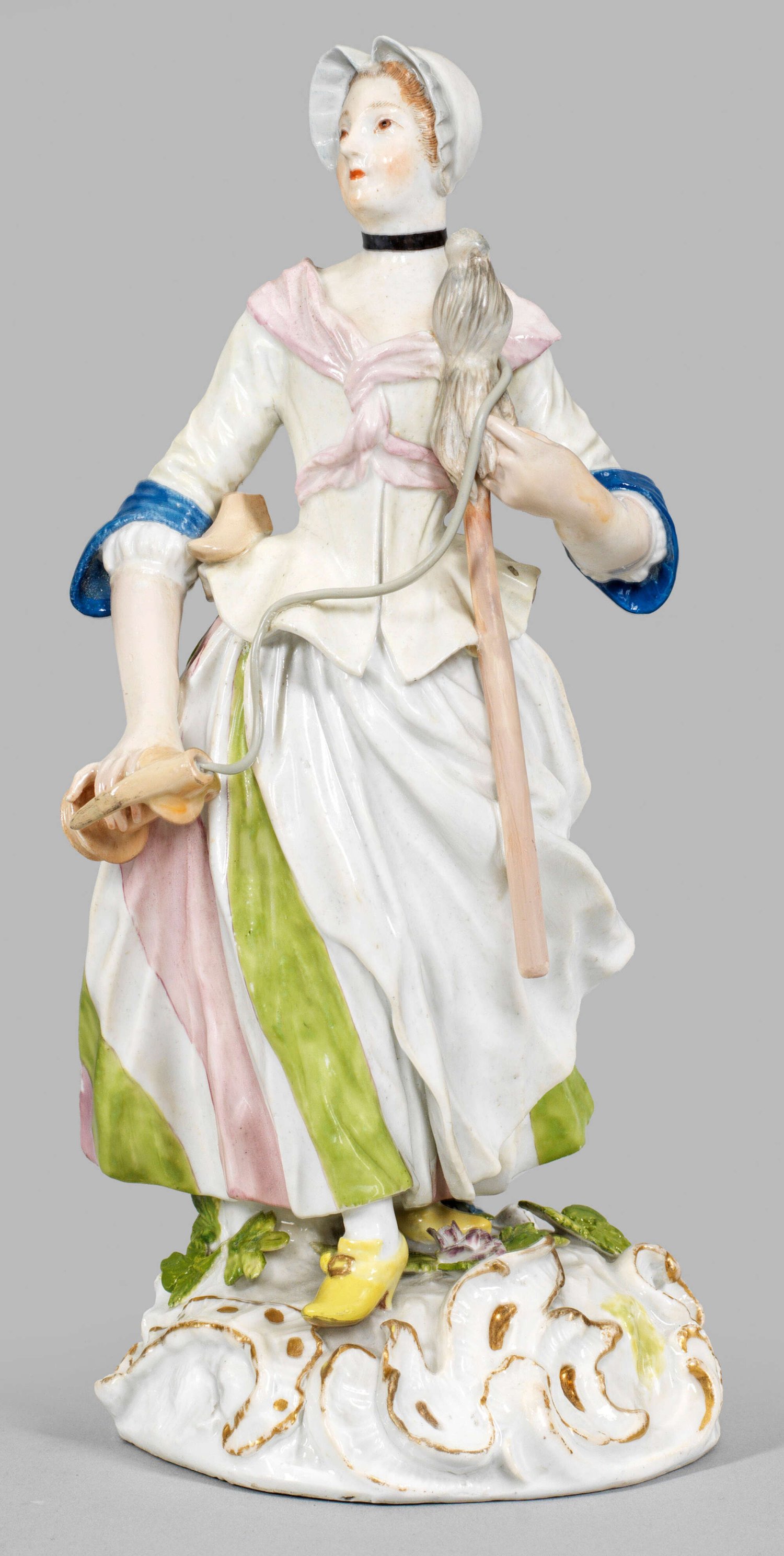 Dame mit Spinnrocken Auf rocaillereliefiertem, mit plastischen Blüten und Blättern belegtem Sockel stehende Spinnerin in gestreiftem Rock und hellem Mieder. Das Haar von einer Haube bedeckt. In der linken Hand einen Rocken, in der Rechten die Spule haltend. Polychrome Malerei mit Goldstaffage. Entw. Johann Joachim Kaendler. Rest.; Schwertermarke. H. 21,5 cm.