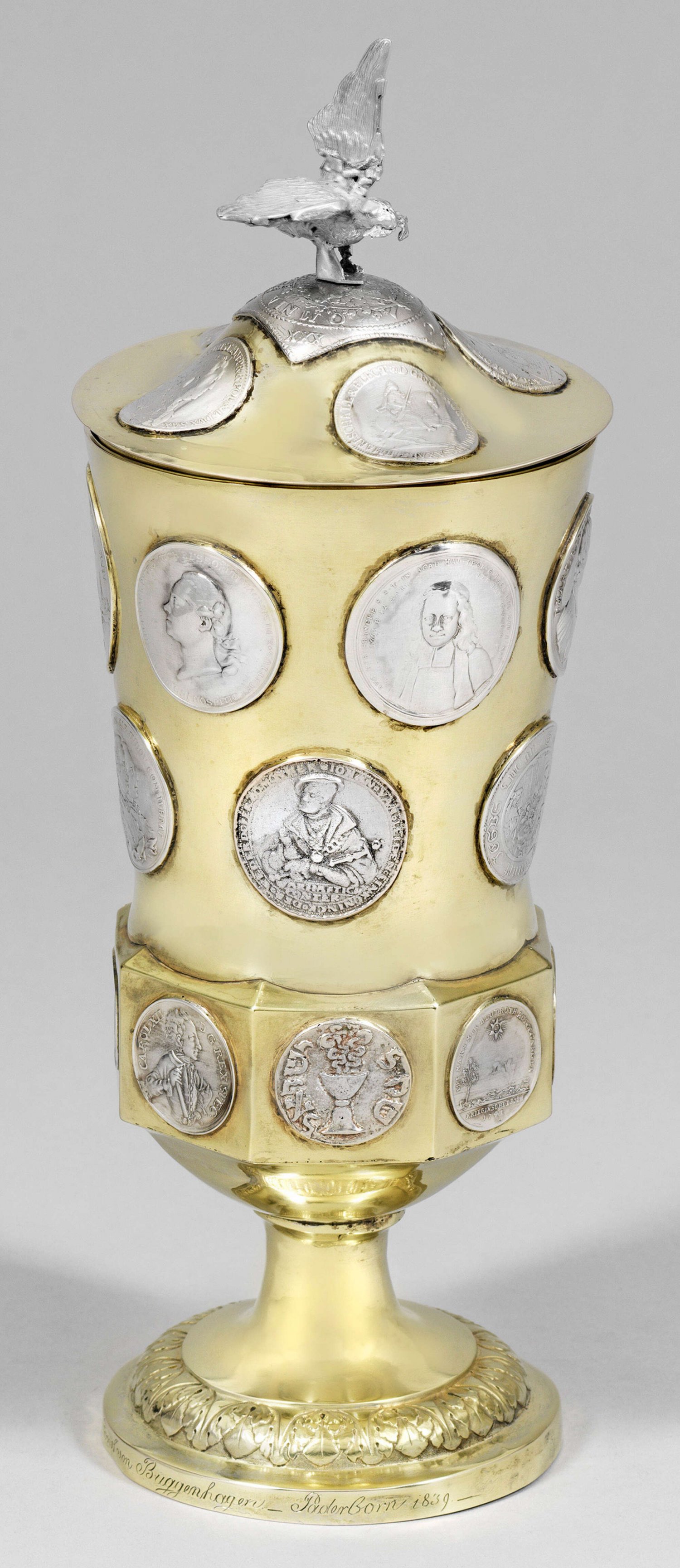 Seltener Biedermeier-Münz-Deckelpokal Silber, vergoldet. Trompetenförmiger, von einem Blattfries gerahmter Stand, schauseitig gravierter Namenszug "Dettloff Ernst von Buggenhagen Paderborn" sowie Wappengravur, dat. 1839. Hoher, am Ansatz achtfach facettierter, ausschwingender Kelch. Wandung dreireihig besetzt mit 19 unterschiedlichen (Gedenk-)Münzen vom 17. Jh. - 18. Jh.; Im Boden eingelassene 5 Francs-Münze mit dem Porträt von Napoleon Bonaparte von 1812. Auf gewölbtem Deckel vier Taler sowie eine zentrale, sächsische-albertinische Talerklippe von 1630. Plastischer Knauf in Gestalt eines Adlers. Unw. besch.; Gest. 12 Lot, Meister Franz Anton Evers (heiratet 1831). Gew. ca. 975 g. H. 34 cm.