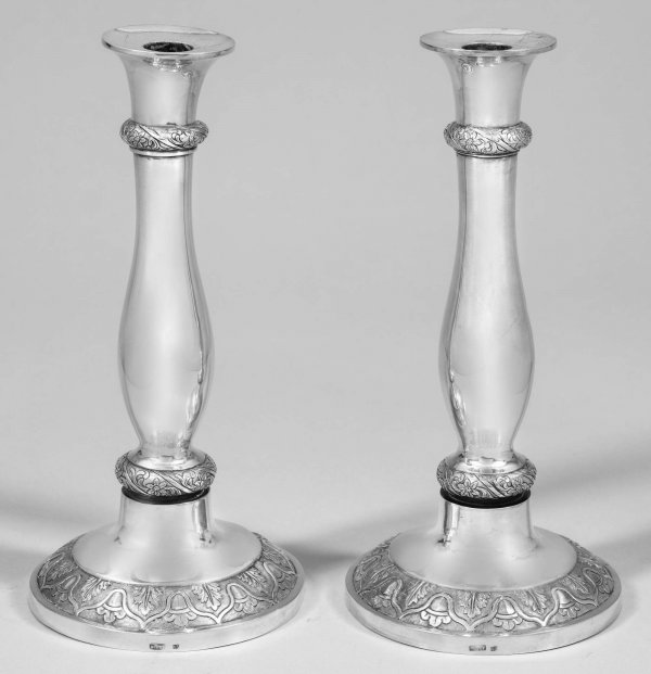 Paar Biedermeier-Tafelleuchter Silber. Gewölbter Stand, am Rand umzogen von breitem Relieffries aus stilisierten Knospen und Akanthusblättern. Von floral reliefierten Nodi begrenzter Balusterschaft, übergehend in konische Tülle. Gest. 13 Lot, wohl Meister Wilhelm Christoph Werner (wird Meister um 1806). Gew. zus. ca. 690 g. H. 27 cm.