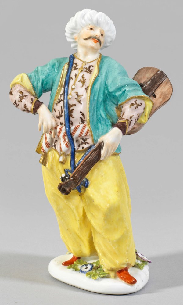 Türke mit Gitarre Auf einem, mit plastischen Blüten und Blättern belegter Sockel stehender, schnurrbärtiger Orientale mit Turban in gelber Hose, blütengemustertem Hemd und seegrüner Jacke. In der linken Hand eine Gitarre haltend. Polychrome Malerei. Entw. Peter Reinicke. H. 17,5 cm.
