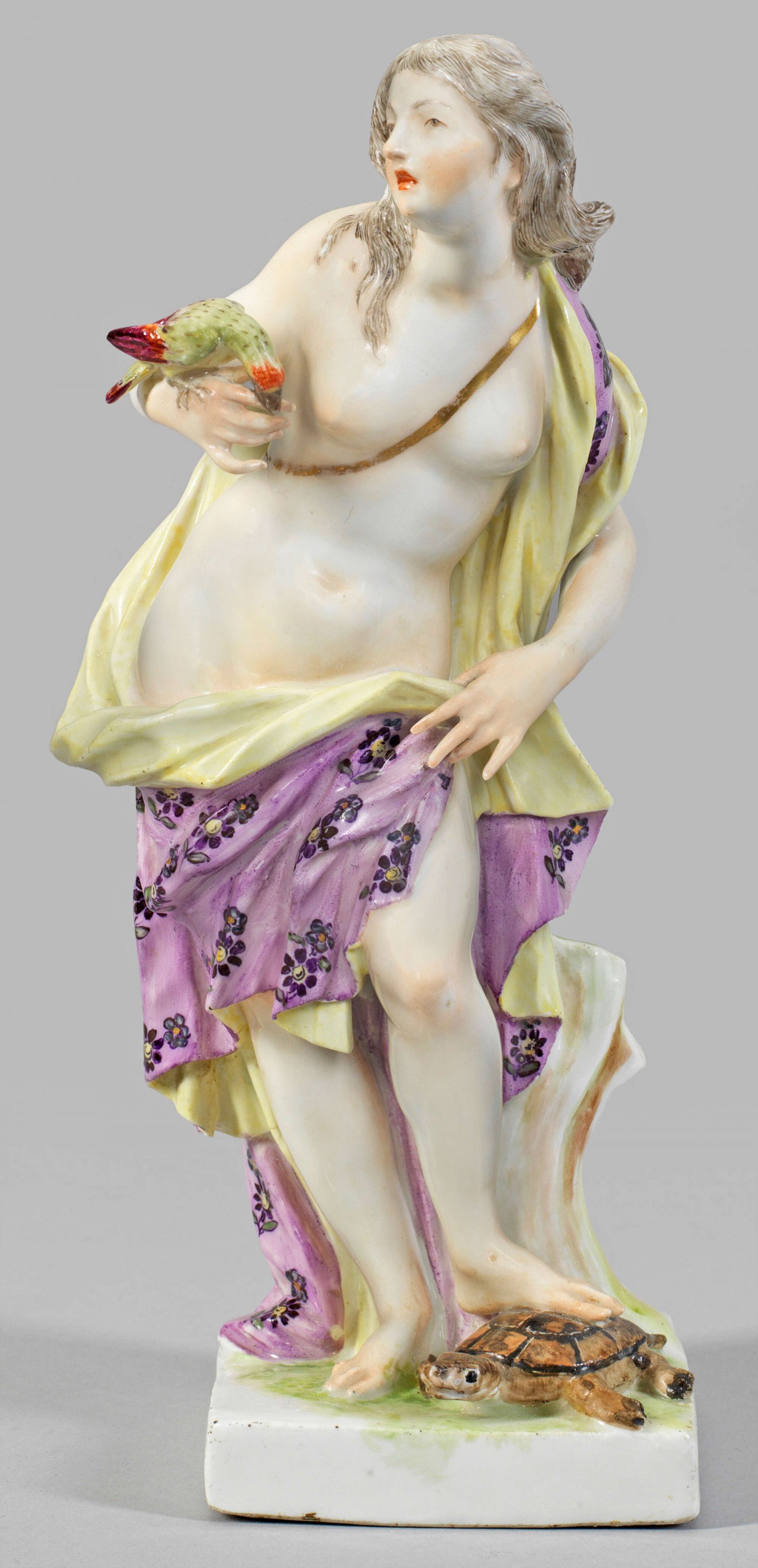 Große allegorische Figur "Das Gefühl" aus der Serie "Fünf Sinne". Auf quadratischer Sockelplinthe stehende, seitwärts blickende junge Dame als Halbakt in einem purpurfarbenen, blütengemusterten und gelb gefütterten Umhang, das linke Bein auf den Panzer einer zu ihren Füßen liegenden Schildkröte gestellt. Auf ihrer rechten Hand ein Papagei sitzend. Entw. Johann Friedrich Eberlein, um 1748. Minim. rest.; H. 26,5 cm.
