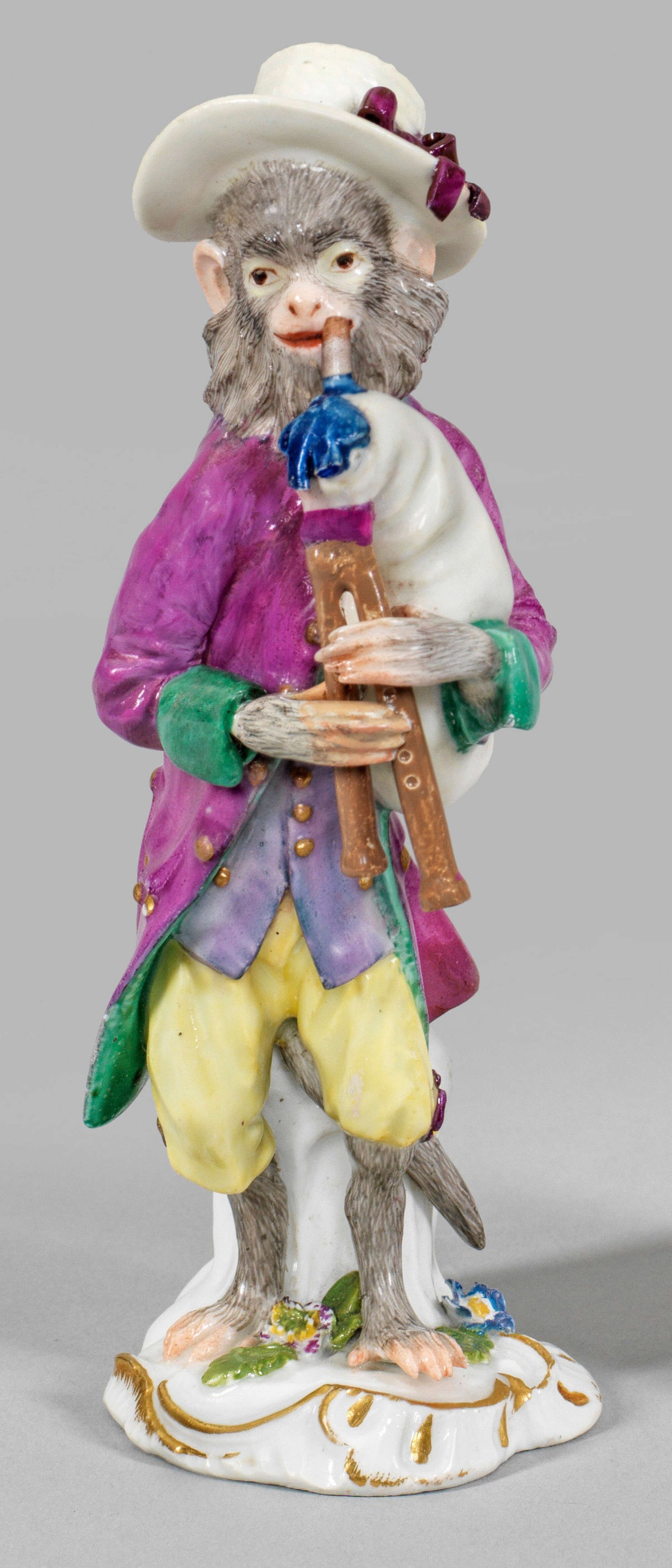 Dudelsackspieler aus der Affenkapelle Auf rocaillereliefiertem, mit plastischen Blumen und Blättern belegtem Sockel stehender, den Dudelsack spielender Musikant. Polychrome Malerei mit Goldstaffage. Entw. Johann Joachim Kaendler und Peter Reinicke. Rest.; Schwertermarke. H. 14 cm.
