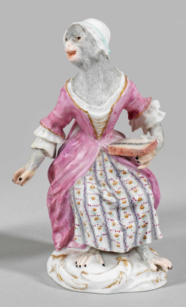 Sängerin aus der Affenkapelle Auf rocaillereliefiertem Sockel sitzende Sängerin, in der linken Hand ein Notenbuch haltend. Polychrome Malerei mit Goldstaffage. Entw. Johann Joachim Kaendler und Peter Reinicke. Rest.; Schwertermarke. H. 12 cm.