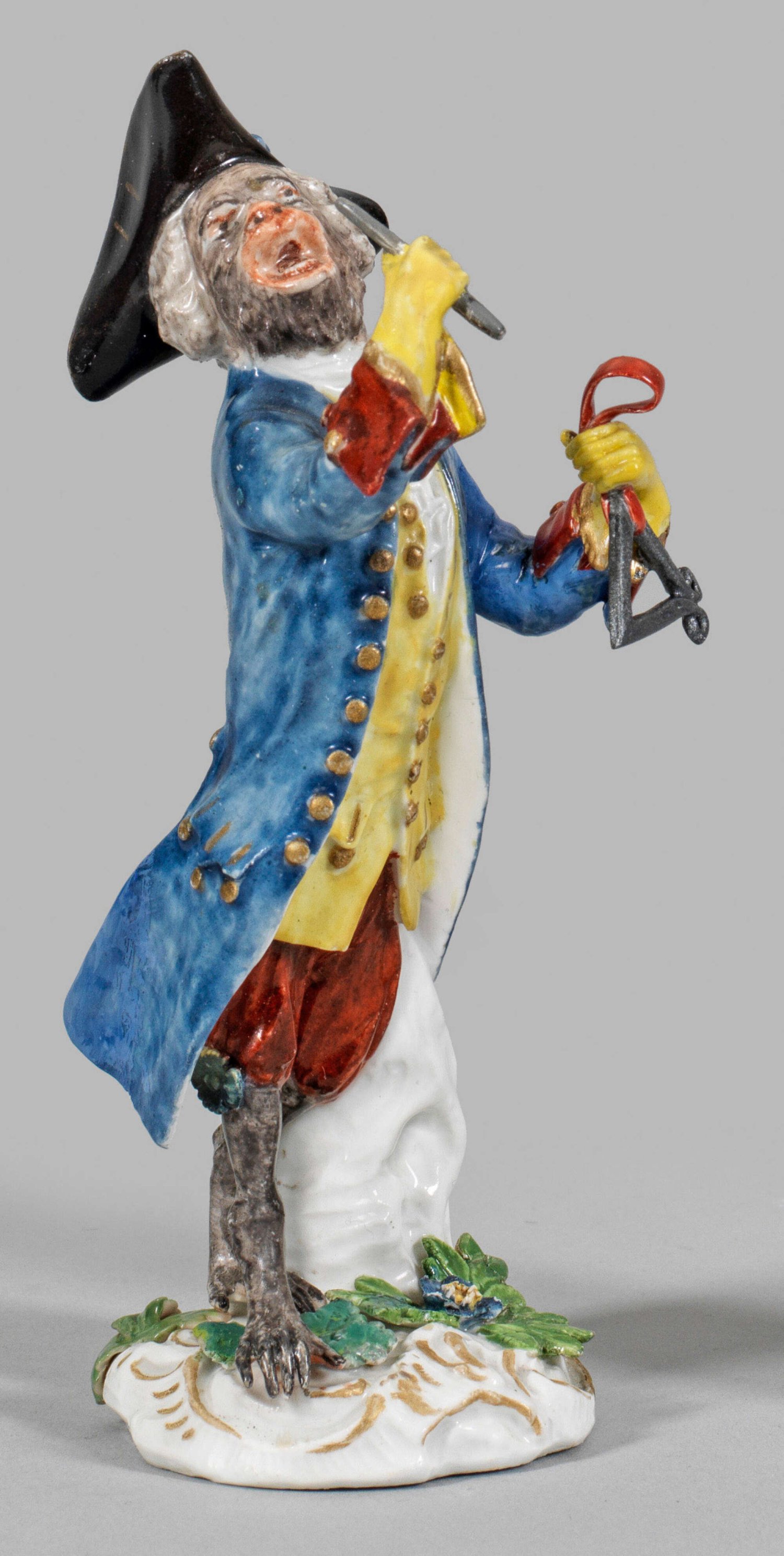 Triangelspieler aus der Affenkapelle Auf rocaillereliefiertem, mit plastischer Blume und Blättern belegtem Sockel stehender Musikant, Triangel und Schläger haltend. Polychrome Malerei mit Goldstaffage. Entw. Johann Joachim Kaendler und Peter Reinicke. Rest.; Schwertermarke. H. 14,5 cm.