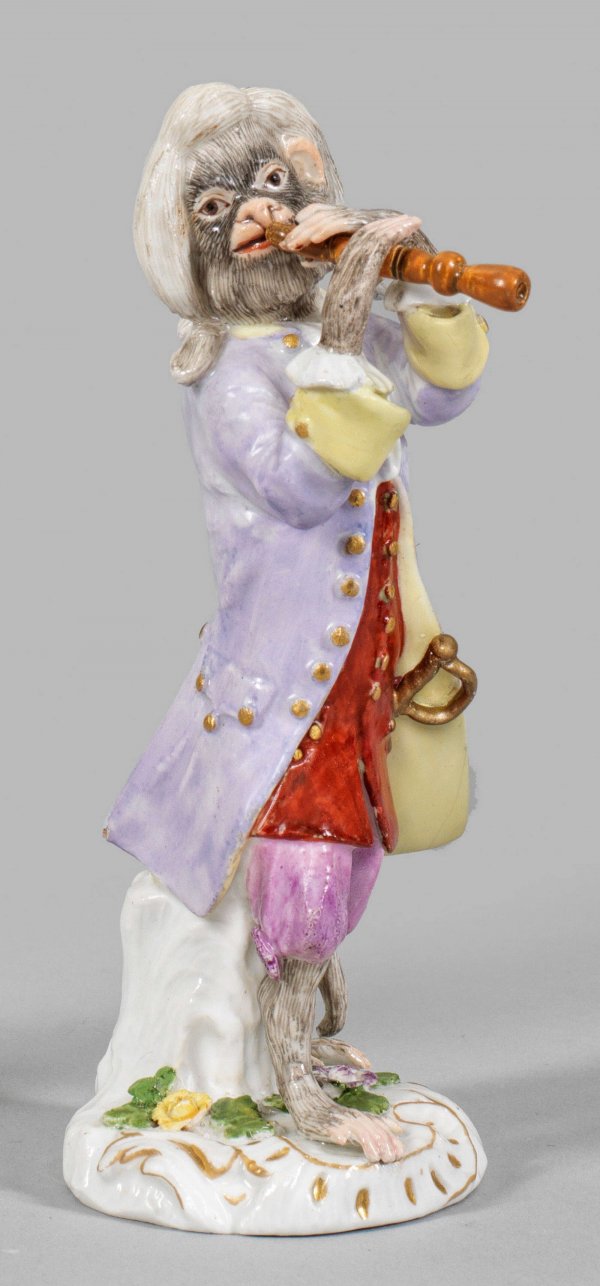 Klarinettist aus der Affenkapelle Auf rocaillereliefiertem, mit plastischer Blume und Blättern belegtem Sockel stehender, die Klarinette spielender Musikant. Polychrome Malerei mit Goldstaffage. Entw. Johann Joachim Kaendler und Peter Reinicke. Rest.; H. 13 cm.