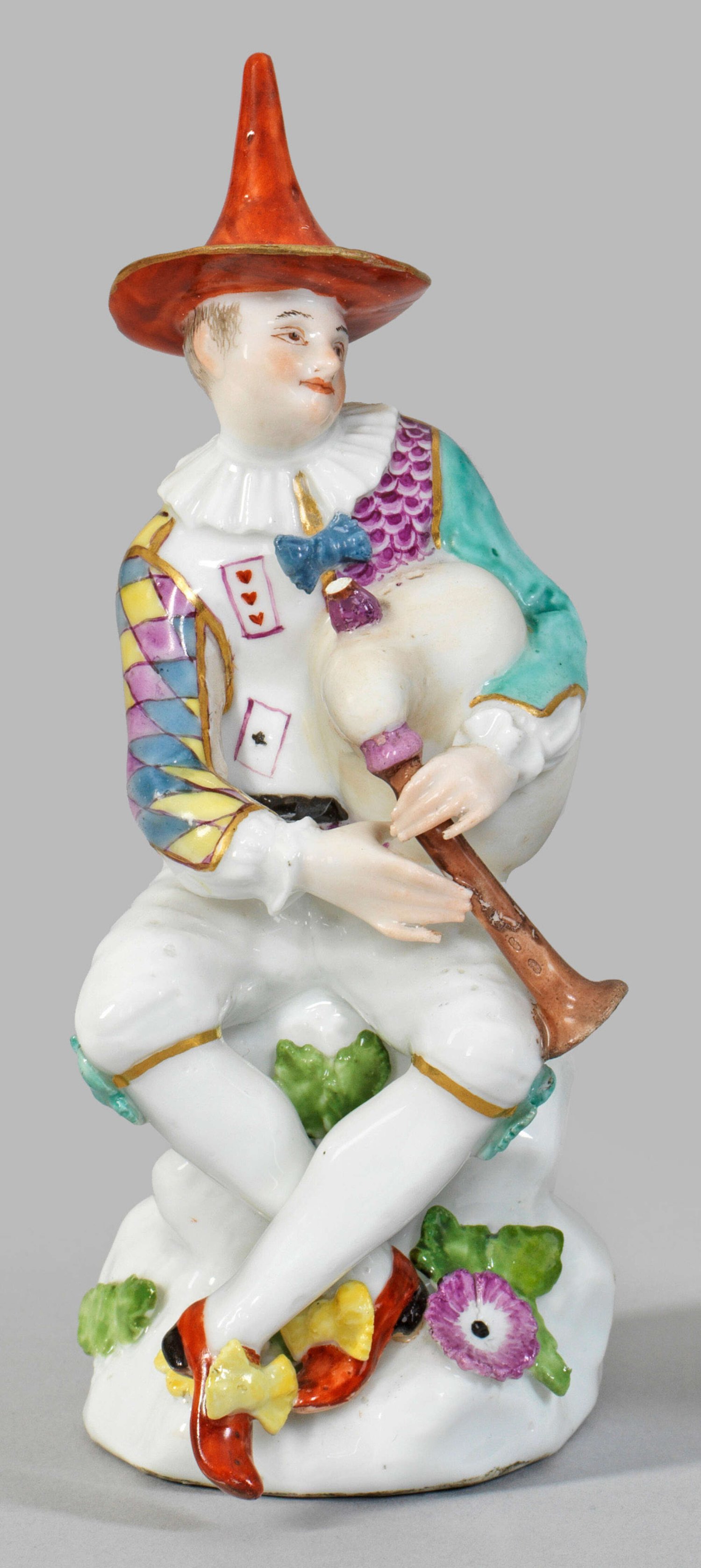 "Harlekin" aus der Italienischen Komödie Auf einem mit plastischen Blüten und Blättern belegten Sockel sitzender junger Komödiant in weißer Kniebundhose und bunter, mit Karo und Spielkarten gemusterter Jacke sowie rotem Spitzhut, einen Dudelsack spielend. Polychrome Malerei mit Goldkonturierung. Entw. Johann Joachim Kaendler. Minim. best./rest.; H. 14 cm.