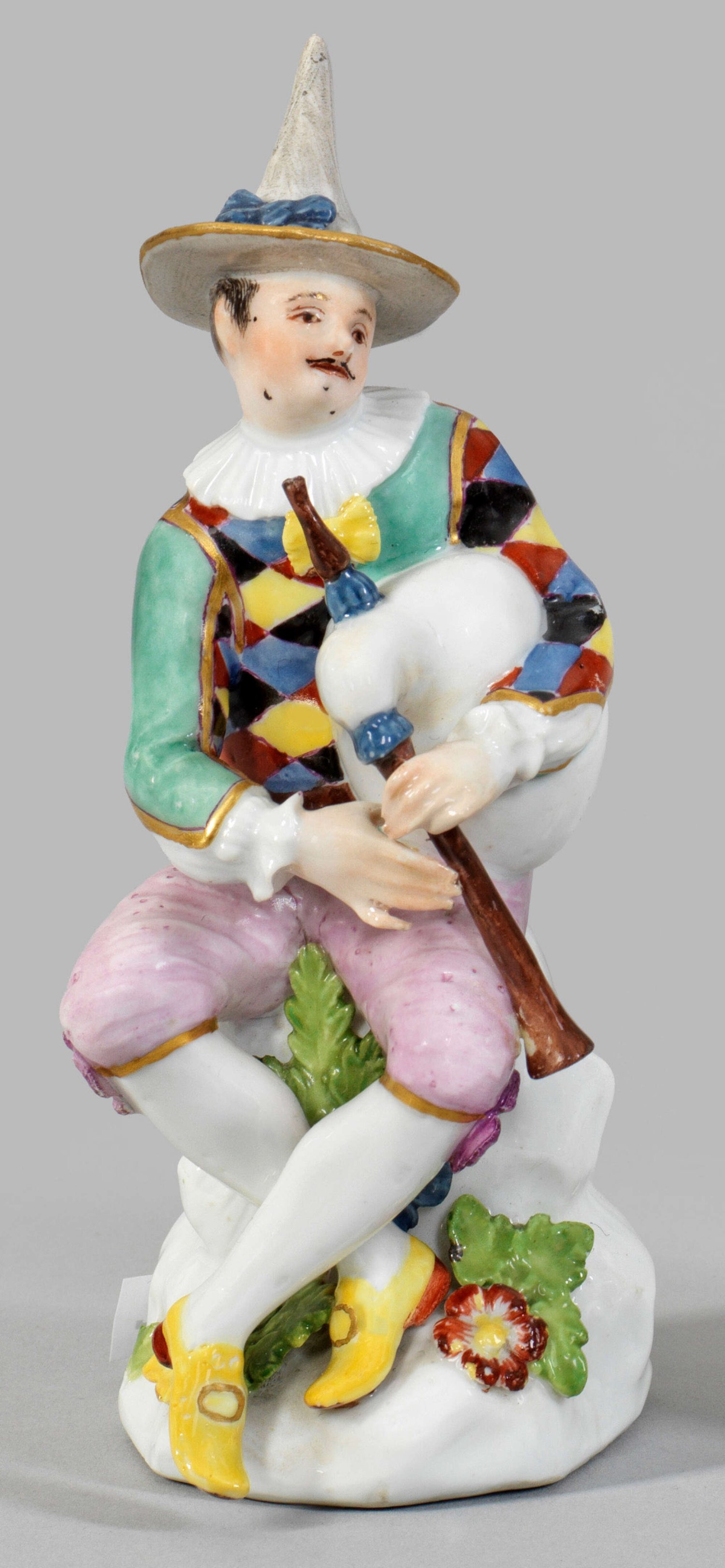 "Harlekin" aus der Italienischen Komödie Auf einem mit plastischen Blüten und Blättern belegten Sockel sitzender junger Komödiant in rosafarbener Kniebundhose und bunter, in Karo gemusterter Jacke sowie grauem Spitzhut, einen Dudelsack spielend. Polychrome Malerei mit Goldkonturierung. Entw. Johann Joachim Kaendler. Minim. rest.; H. 14,5 cm.