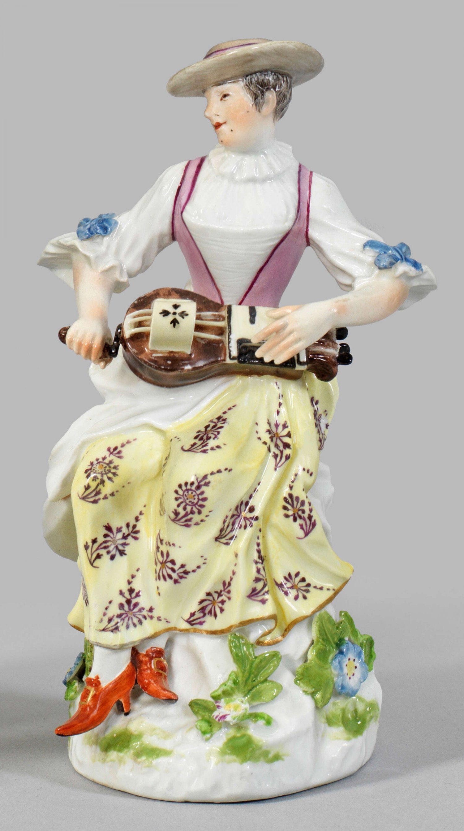 Tirolerin mit Drehleier Auf gehöhtem, mit plastischen Blüten und Blättern belegtem Sockel sitzende Dame in Tiroler Tracht mit blumig gemustertem Rock, weißer Bluse und purpurfarbenem Mieder beim Spielen einer Drehleier. Polychrome Malerei. Entw. Johann Joachim Kaendler. Minim. best./rest.; Schwertermarke. H. 13,5 cm.