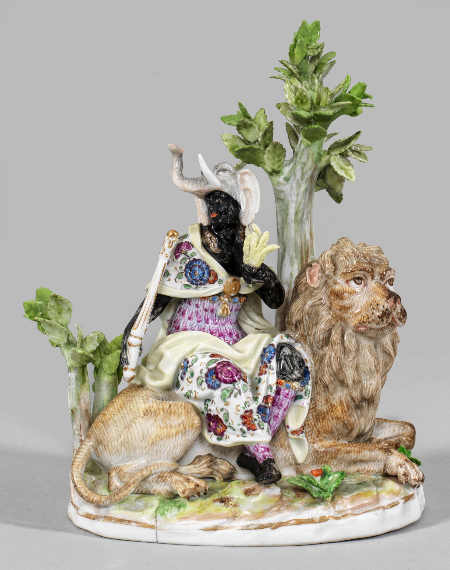 Allegorische Figurengruppe von Afrika aus der Serie "Vier Erdteile". Auf einem Löwen sitzende Afrikanerin in einem von Blüten und Federn gemustertem Gewand. Ihr Haar bedeckt von plastischer Elefantenhaube. Ein Ährenbündel in der linken, ein Zepter in der rechten Hand haltend als Personifikation des Kontinents Afrika. Polychrome Malerei mit wenig Gold. Entw. Johann Joachim Kaendler. Brandrisse. Unw. rest.; Schwertermarke. H. 20,5 cm. 14,5 cm x 10,5 cm.