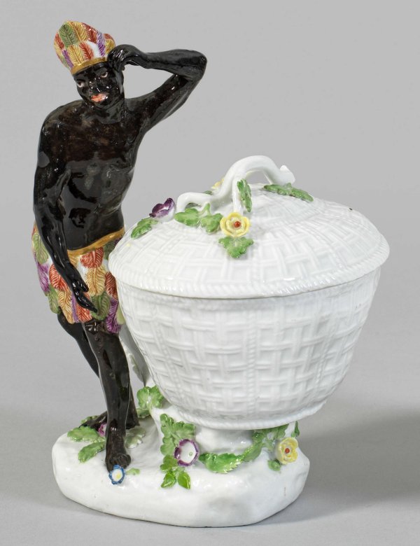 Mohr mit Deckelschale Auf naturalistischem, mit plastischen Blüten und Blättern belegtem Felssockel mit Baumstumpf stehender Mohr mit Lendenschurz und Kopfschmuck aus farbig staffierten Federn. Vor sich ovale, korbreliefierte Deckelschale mit plastischem Blütenzweig. Polychrome Malerei mit sparsamer Goldkonturierung. Entw. Johann Joachim Kaendler und Johann Friedrich Eberlein. Minim. best./ rest.; H. 19,5 cm.