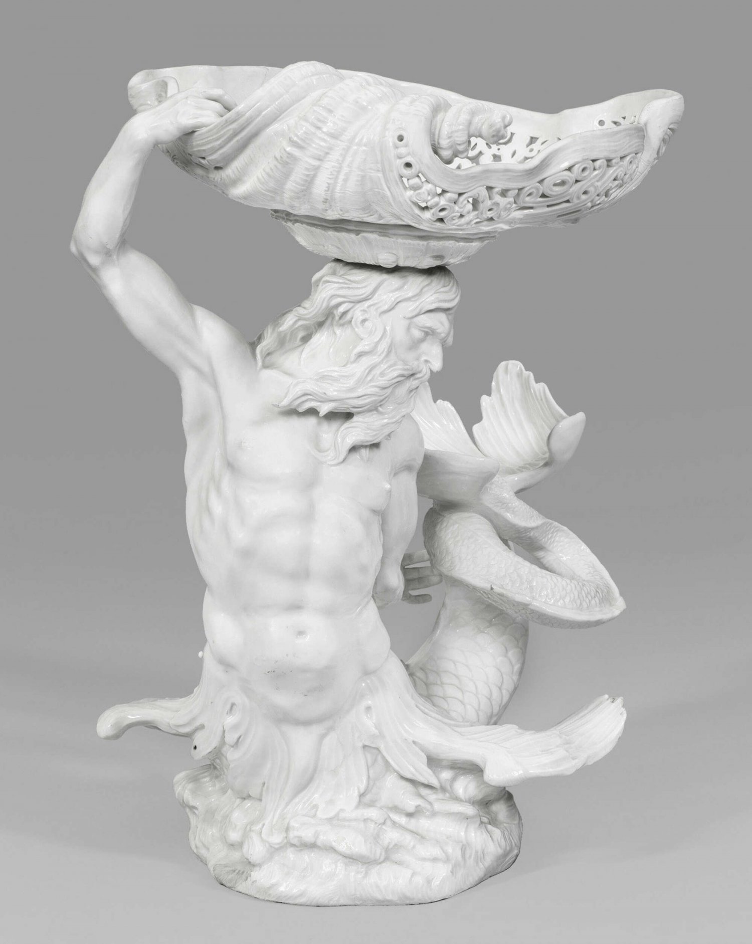 Weißporzellan. Über unregelmäßigem, stark reliefplastischem Wellensockel sich erhebender, vollplastisch ausgearbeiteter, bärtiger Meeresgott Glaukos mit langen, über die Schulter hängenden Haaren und reliefartig geschupptem, sich spiralförmig emporwindendem Fischschwanz als Träger einer geschweiften Aufsatzschale. Muschelförmiger, teilw. von Laub- und Blütenwerk durchbrochen gearbeiteter Korpus mit großer eingerollter Schnecke. Entw. Johann Joachim Kaendler und Johann Friedrich Eberlein, 1738/1739. Minim. best./rest.; H. 45 cm.