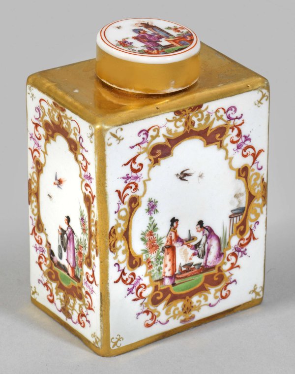 Teedose mit Hoeroldt-Chinoiserien Hochrechteckige Form mit flacher Schulter und kurzem Hals. Übergreifender, zylindrischer Deckel. Auf der Wandung vierpassige, von eisenrotem und purpurfarbenem Laub- und Bandelwerk gerahmte Goldornamentreserven mit Lüsterfond. Darin szenische Darstellungen festlich gekleideter Chinesen in blühenden, asiatischen Gärten beim Verrichten verschiedener Arbeiten bzw. Teezeremonie. Äußerst feine poylchrome Malerei in Eisenrot, Purpur, Grün, Blau, Braun und Schwarz. Gefäßschulter vergoldet. Im Boden Sammlungsetikett "Byrnes Children‘s Trust, Nr. G 13". Reste der Goldnr. 86. Minim. ber.; Schwertermarke in blauer Aufglasur. H. 11 cm. 5 cm x 7,5 cm.