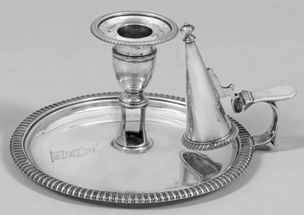 Handleuchter Silber. Runder, leicht gemuldeter Stand mit seitlichem Ringgriff, daran kegelförmiger Löschhut. Mittig hoher Sockel mit zentraler Aussparung, übergehend in vasenförmige Tülle. Ränder umzogen von Stabfriesen. Herausnehmbare Traufschale und Löschhut von 1778 erg.; Gest., Beschaumarken, Meister John Mewburn (tätig seit 1793) bzw. undeutl. gest.; Gew. ca. 405 g. H. 8,7 cm.