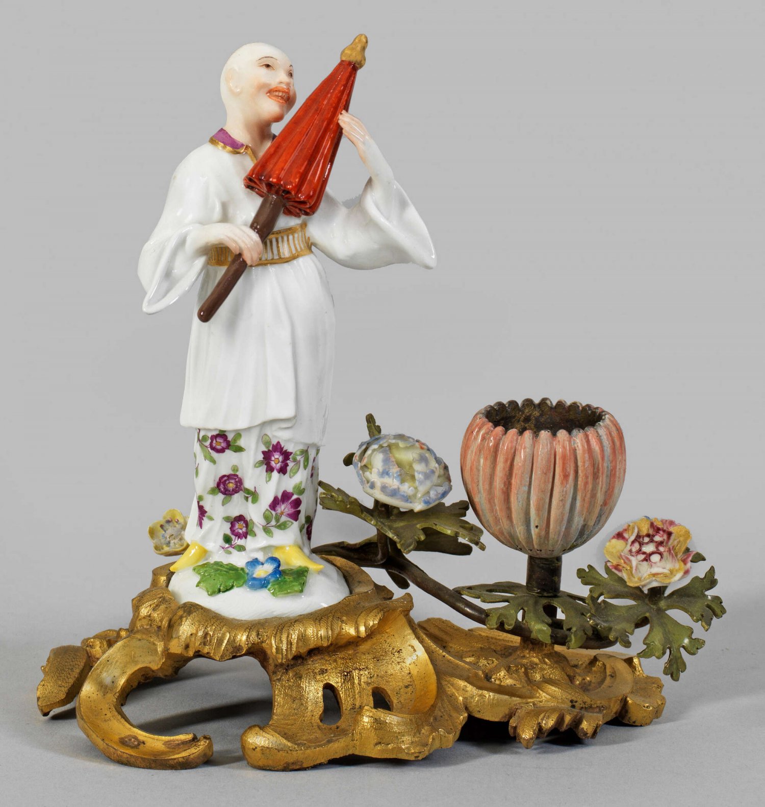Kleiner Kerzenhalter "Japanerin mit Schirm" Vergoldete, französische Bronzemontierung. Aus stark geschweiften, reliefplastischen Blattvoluten gearbeiteter Sockel mit vollplastischer Darstellung einer Japanerin, in den Händen einen roten Schirm haltend. Seitlich aufsteigende Blattranken mit Kerzenhalter in Gestalt einer Chrysantheme aus farbig gefasstem Metall sowie fein modellierte "Vincennes"-Porzellanblüten. Polychrome Malerei mit Goldstaffage. Entw. Peter Reinicke, um 1743. Bronzemontierung mit "Couronne-Marke" als französische Steuermarke für Paris, 1745 - 1749. Minim. rest.; Schwertermarke. H. 14,5 cm.