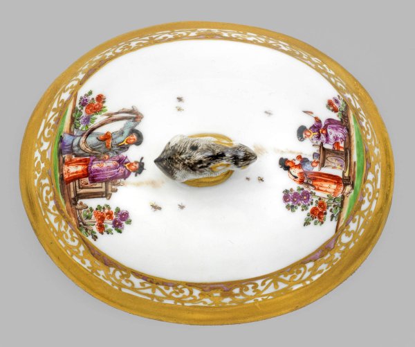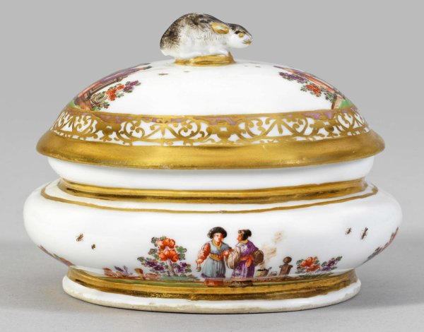 Prächtige Zuckerdose mit Hoeroldt-Chinoiserien Ovaler, bombierter Korpus mit profiliertem Rand. Eingelassener, gewölbter Deckel, mittig plastischer Knauf in Gestalt eines sitzenden Hasen mit naturalistisch staffierter Fellzeichnung. Umlaufend auf der Wandung unterschiedliche, szenische Darstellungen von festlich gekleideten Chinesen zwischen blühenden Päonien- und Chrysanthemenbäumen auf grünem Terrain bei der Zubereitung von Speisen bzw. während der Teezeremonie, sog. Chinoiserien. Äußerst feine polychrome, teilw. Gold gehöhte Malerei in Eisenrot, Purpur, Grün, Braun und Schwarz aus der Werkstatt von Johann Gregorius Hoeroldt. Korrespondierender Dekor auf dem Deckel, gerahmt von breiter Goldornamentbordüre mit leichtem Lüsterfond. Goldnr. 27. Schwertermarke. H. 9 cm. 12 cm x 11,5 cm.