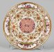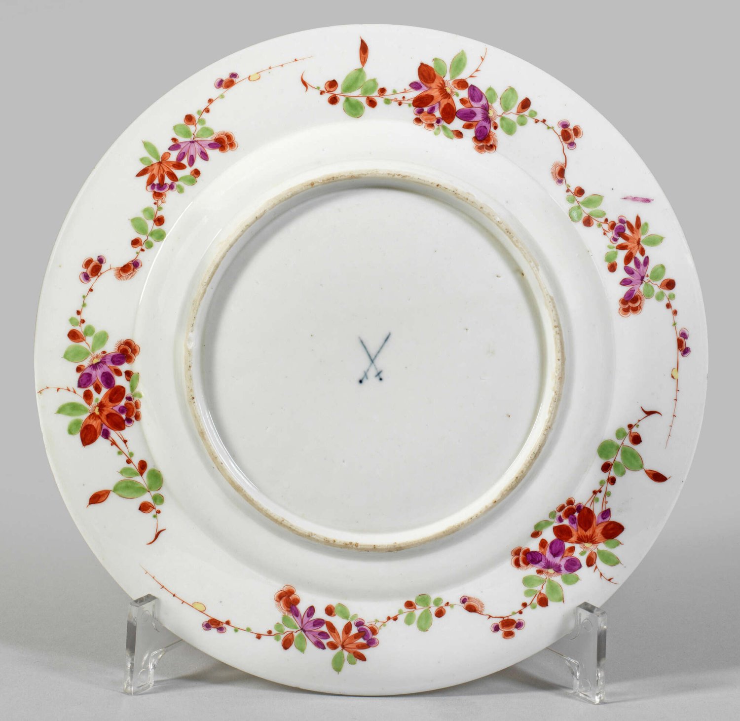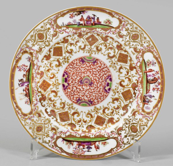 Seltener Zierteller mit Hoeroldt-Chinoiserien Runde Form. Im leicht vertieften Spiegel ein zentrales, von doppelter, eisenroter Ringlinie gerahmtes Rundmedaillon mit floralem Fond aus weiß ausgespartem, stilisiertem Blattwerk, farbigen Päonien und Chrysanthemen. Umlaufender Golddekor mit Lüsterfond aus Laub- und Bandelwerk sowie sieben Rhomben mit Brokatmuster. Korrespondierender Dekor mit ovalen Goldmedaillons auf der Fahne, im Wechsel mit sog. Chinoiserien in passig ausgesparten Reserven. Szenische Darstellungen „en miniature“ von festlich gekleideten Chinesen in blühender, asiatischer Gartenlandschaft bei der Teezeremonie bzw. bei der Konversation. Auf der Unterseite der Fahne langgezogene Indianische Blütenzweige in Eisenrot, Purpur und Moosgrün. Polychrome Malerei mit reichem Golddekor. Schwertermarke. D. 21,5 cm.