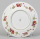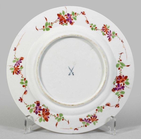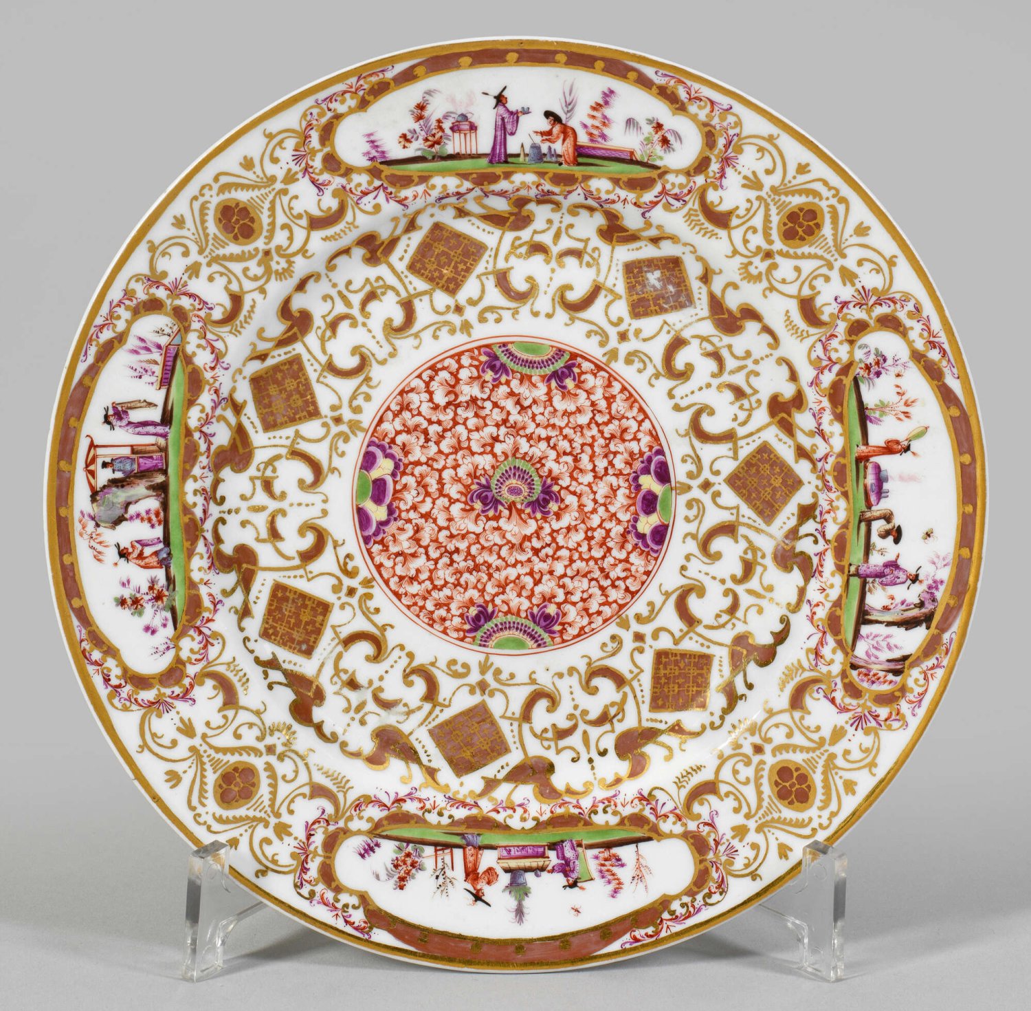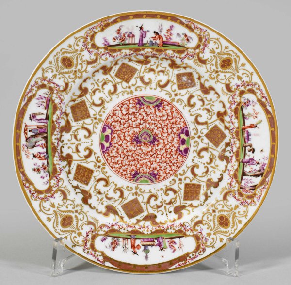 Seltener Zierteller mit Hoeroldt-Chinoiserien Runde Form. Im leicht vertieften Spiegel ein zentrales, von doppelter, eisenroter Ringlinie gerahmtes Rundmedaillon mit floralem Fond aus weiß ausgespartem, stilisiertem Blattwerk, farbigen Päonien und Chrysanthemen. Umlaufender Golddekor mit Lüsterfond aus Laub- und Bandelwerk sowie sieben Rhomben mit Brokatmuster. Korrespondierender Dekor mit ovalen Goldmedaillons auf der Fahne, im Wechsel mit sog. Chinoiserien in passig ausgesparten Reserven. Szenische Darstellungen „en miniature“ von festlich gekleideten Chinesen in blühender, asiatischer Gartenlandschaft bei der Teezeremonie bzw. bei der Konversation. Auf der Unterseite der Fahne langgezogene Indianische Blütenzweige in Eisenrot, Purpur und Moosgrün. Polychrome Malerei mit reichem Golddekor. Minim. ber.; Schwertermarke. D. 21,5 cm.