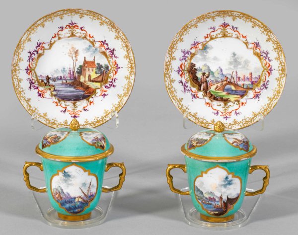 /V/A pair of two-handled sea-green ground cups with lid and saucer depicting figural scenes in landscape and Kauffahrtei scenes. Partly old handwritten collector's label of Sir Charles Rugge Price, 1867. Gold painter's no.; Partly minor rubbed. Crossed swords mark.
