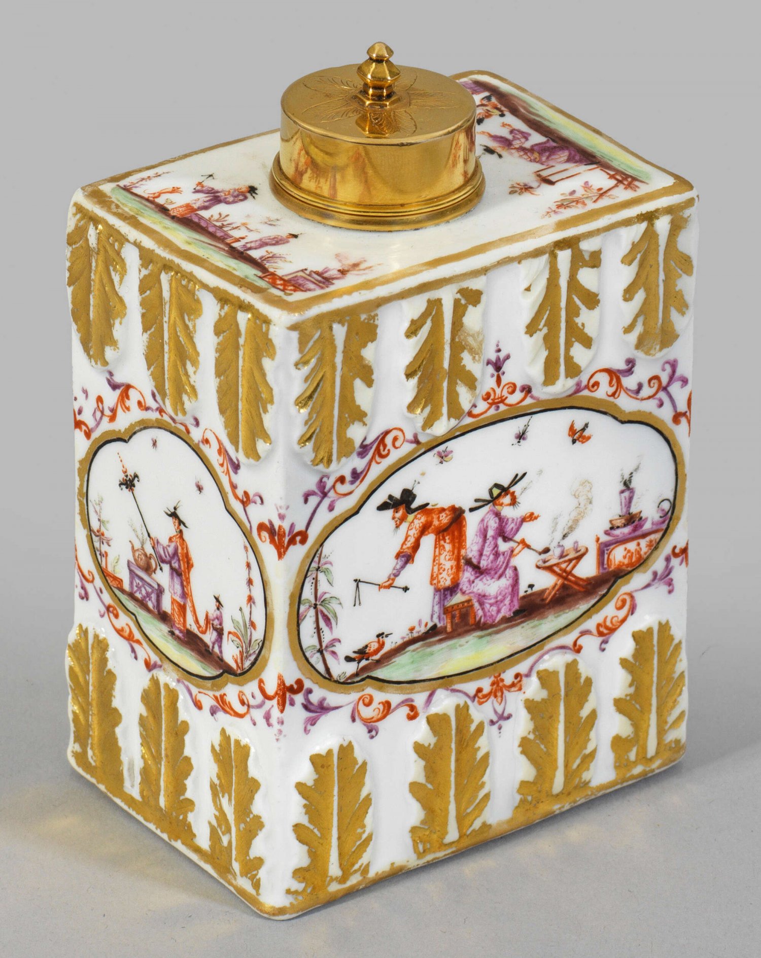 Seltene Teedose mit Akanthusrelief und Chinoiserien Hochrechteckiger Korpus mit flacher Schulter und kurzem Hals. Auf der Wandung umlaufend angeordnete Akanthusblattreliefs sowie vierpassige, in Gold und Schwarz konturierte Reserven mit szenischer Darstellung von festlich gekleideten Chinesen in blühender, asiatischer Gartenlandschaft, teilw. mit Kindern, beim Verrichten unterschiedlicher Tätigkeiten. Korrespondierende Darstellung auf der Schulter. Feine polychrome Malerei mit reicher Goldstaffage. Formerzeichen Caspar Meißner Senior (1689 - 1751). Deckel erg.; Gold teilw. ber.; Schwertermarke. H. 8,5 bzw. 11 cm. 7 cm x 5 cm.