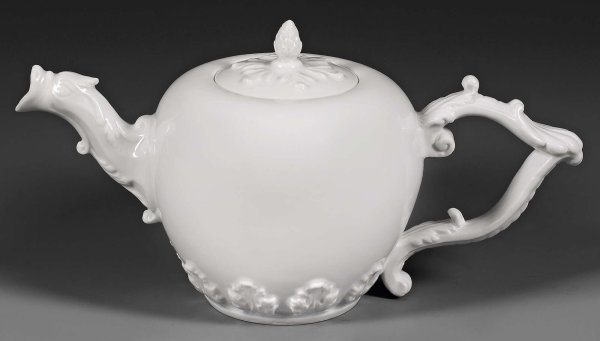 Kleine Teekanne mit Akanthusrelief Kugelige Form, seitlich J-Henkel mit plastischer Palmettenauflage, gegenüber röhrenförmiger Ausguss in Gestalt eines Tierkopfes. Eingelassener Deckel; mittig in reliefiertem Blattkranz plastischer Pinienkauf. Schwertermarke. H. 10 cm.