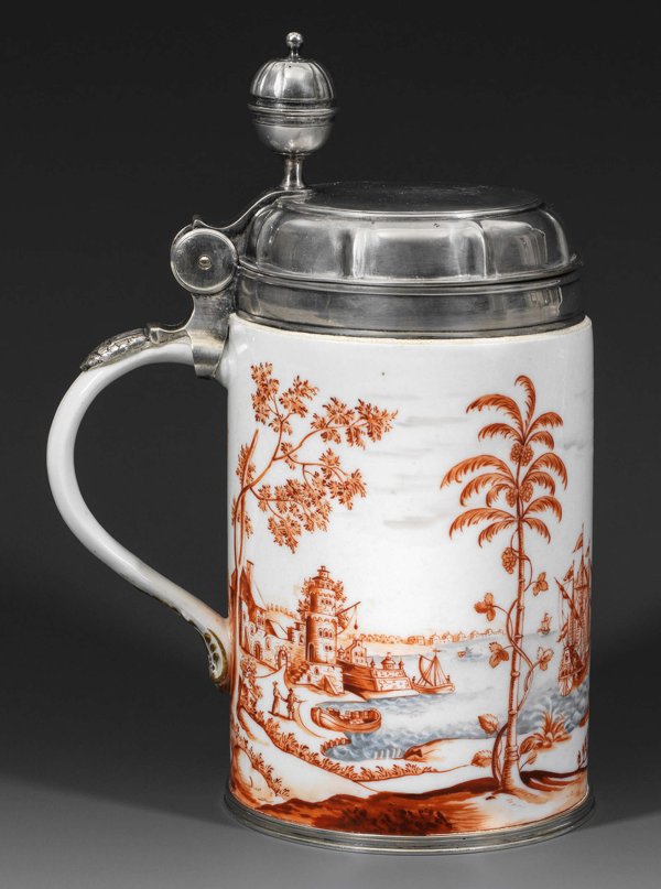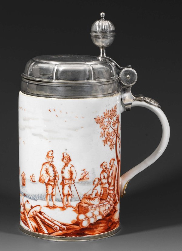Zylindrische Form mit gerundetem, unterhalb blattreliefiertem Bandhenkel. Auf der Wandung umlaufende, mehrfigurige Kauffahrteiszene vor dem Hintergrund herannahender Segelschiffe und Boote unter leicht bewölktem Himmel mit Vogelschwärmen. Am Küstenufer stehende europäische Kaufleute in Pumphosen, mit Zipfelmützen und Gehstöcken. Gegenüber, auf verschnürten Kisten zwischen Warenballen und Fass sitzender, Pfeife rauchender Chinese. Unweit davon an einem emporragenden Baum stehende, ins Gespräch vertiefte asiatische Seeleute. Im Vordergrund liegende Kanonenrohre und Anker. Angrenzend eine von Weinreben umrankte Palme vor abfahrender, dreimastiger Galeone. Rückseitig dargestellte bebaute Uferlandschaft mit Stadtbefestigung, landenden Booten und Figurenstaffage. Eisenrote Camaieumalerei von Ignaz Preissler aus Breslau. Zarte, in Blaugrau getönte Staffage der Wellen. Unw. rest.; Erg. versilberte, innen vergoldete Deckelmontierung mit kugelförmiger Daumenrast, grav. S und dat. 1756. Ges.-H. 23,5 cm.