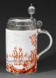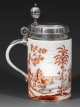 An exceptional Hausmaler tankard with Kauffahrtei scene in iron-red by the Bohemian painter Ignaz Preissler. Insignificant restoration. Plated and inside gilt lid mount added.