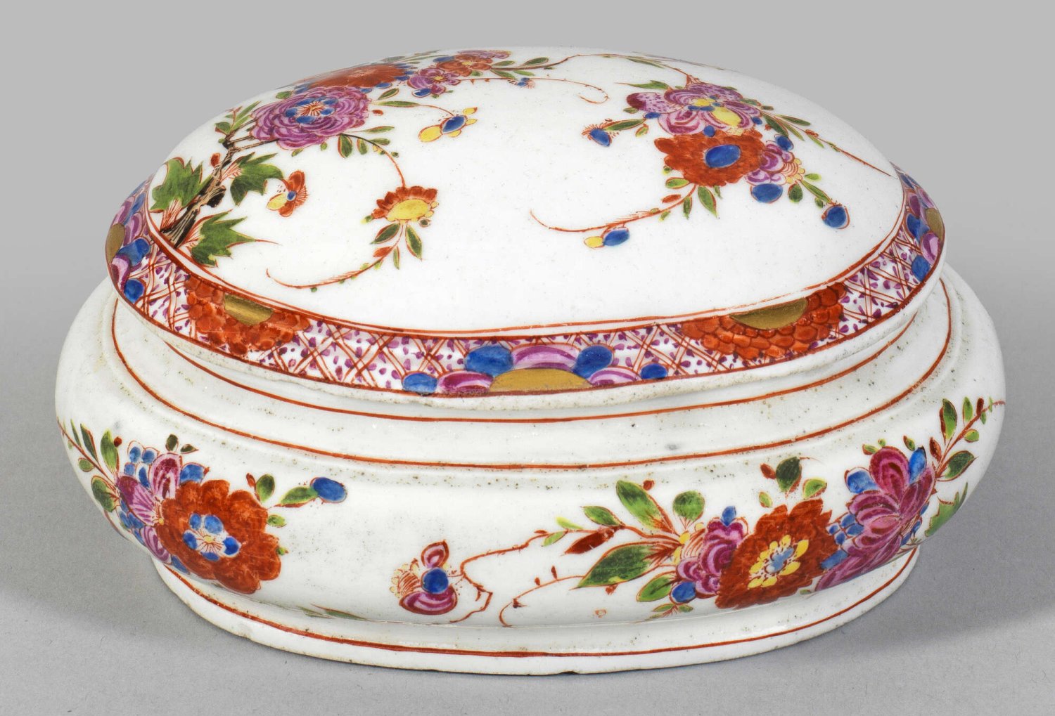 Seltene frühe Zuckerdose mit Indianischem Blumendekor Böttgerporzellan. Ovaler, bombierter Korpus mit eingelassenem, gewölbtem Deckel. Auf der Wandung und dem Deckel langgezogene, farbenprächtige Indianische Blütenzweige bzw. emporwachsendes Gebinde in der Art des Kakiemondekors. Umlaufende Brokatbordüre mit asiatischen Blumen. Polychrome, teilw. Gold gehöhte Malerei in Eisenrot, Purpur, Grün, Blau und Gelb. Schwerter- und "K.P.M."-Marke in Unterglasurblau. H. 7 cm. 12,5 cm x 10 cm.