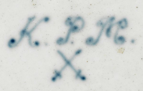 Die "K.P.M."- Marke mit Schwertermarke wurde in der Meißener Porzellan-Manufaktur lt. Verfügung vom 7.4.1723 eingeführt und war wohl nur äußerst kurze Zeit, bis ca. 1725 in Gebrauch. Der Dekor aus großen Päonien- und Chrysanthemenzweigen geht auf ostasiatische Vorbilder zurück. Die Art der Arrangements sowie die Gestaltung der Brokatbordüre erinnern an die Malerei von Johann Ehrenfried Stadler oder Johann Christoph Horn, die in den 1720er Jahren als Porzellanmaler in Meißen tätig und auf ostasiatische Blumen und Chinoiserien spezialisiert waren.