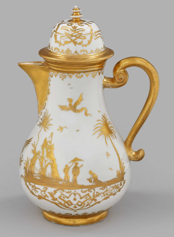 Kaffeekanne mit Augsburger Goldchinesen Böttger-Porzellan. Birnförmig mit kurzem, spitzem Schnabelausguss und Volutenhenkel. Beidseitig der Wandung von hohen Bäumen flankierte szenische Darstellungen sog. Goldchinesen am Ufer eines Flusses mit Segelschiff. Rückseitig, vor Felsenarchitektur stehende hochgestellte Persönlichkeit mit Dienern. Unterhalb des Ausgusses großer Phantasievogel. Deckel umzogen von breiter Bordüre. Feine, radierte Goldmalerei der Seuter-Werkstatt. Im Boden Reste von Eisengallustinte. H. 20,5 cm.