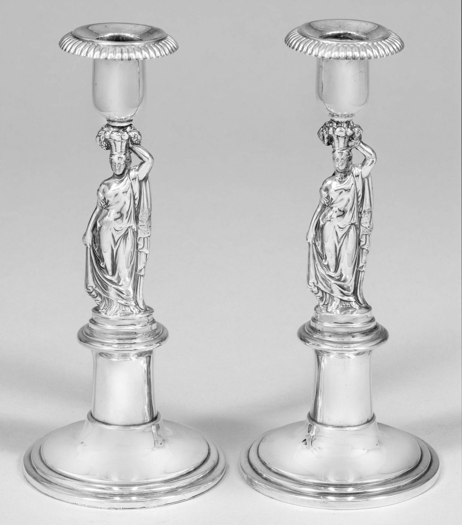 Paar Empire-Tafelleuchter Silber. Randprofilierter, trompetenförmiger Stand. Figuraler Schaft in Gestalt einer Korbträgerin in antikisierender Kleidung. Zylindrische Tülle mit weit ausschwingendem Rand, minim. Gebrauchsspuren. Gest. 13 Lot, Stadtmarke, Meister Johann Samuel Schoenberg (wird Meister 1805). Gew. zus. ca. 250 g. H. 22 cm.