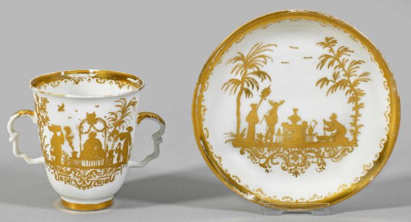 Früher Doppelhenkelbecher mit Augsburger Goldchinesen und Unterschale. Böttgerporzellan. Konisch ansteigender Korpus, seitlich gegenläufige Volutenhenkel. Beidseitig der Wandung und im Spiegel sog. Augsburger Goldchinesen in Gartenlandschaft. Von breiten Konsolen aus Laubwerk getragene, szenische Darstellung einer unter Baldachin sitzenden, hochgestellten Persönlichkeit bzw. einem Chinesen beim Flanieren sowie Zubereiten von Speisen. Umlaufend Bordüre aus C-Schnörkeln. Feine, radierte Goldmalerei der Augsburger Seuter-Werkstatt. H. 7,5 cm.