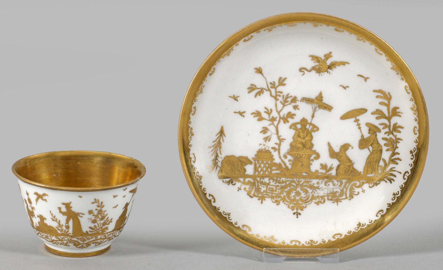 Frühes Koppchen mit Augsburger Goldchinesen und Unterschale. Böttger-Porzellan. Konisch ansteigender Korpus. Auf der Wandung und im Spiegel Chinoiserien auf Laub- und Bandelwerkkonsolen. Szenische Darstellung von Chinesen zwischen Palmen und blühenden Bäumen wandelnd bzw. hochgestellte Persönlichkeit, unter einem Schirm sitzend. Äußerst fein radierte Goldmalerei aus der Seuter-Werkstatt, wohl von Abraham Seuter. Teilw. Innenrandbordüre aus C-Schnörkeln mit Punktrücken. Innenwandvergoldung. Reste von Eisengallustinte mit Buchstabe "M". H. 4,5 cm.